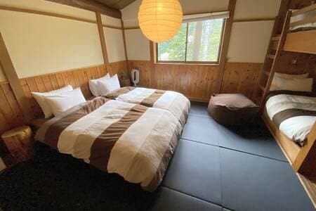 Welcome to the Yukiguma Lodge, a family-run Japanese-style hotel, offering private rooms with shared amenities. Enjoy the comfort of our cozy double room with comfortable futons on traditional tatami flooring. The room features individual heating, ample storage, and access to high-speed Wi-Fi.