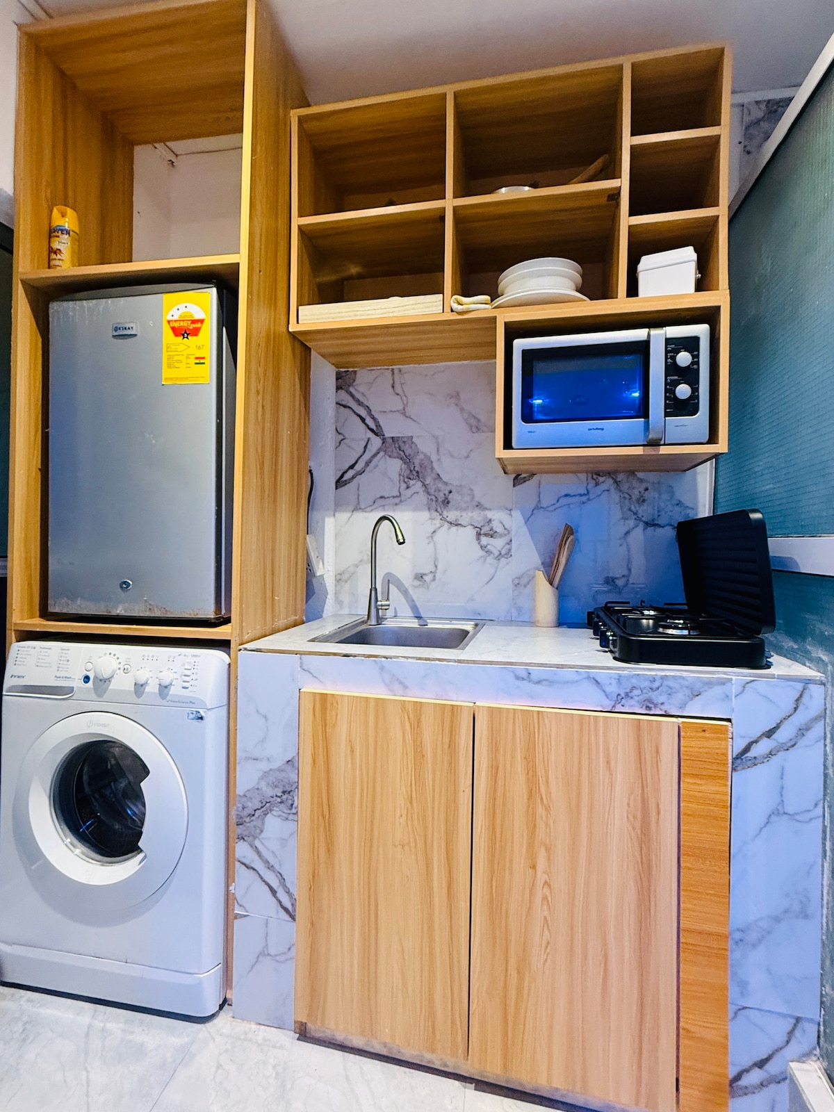 Enjoy your stay at my quiet and simple studio! This spacious flat is perfect for singles or a couple looking for a peaceful stay. It includes a large private bedroom with a king bed and a study desk, private bathroom, and well equipped kitchenette. It is 7 minus walk from the LA beach. Stand in the balcony and enjoy the beautiful view. There are plenty of shops within walking distance, including bars and restaurants or relax at home and watch Netflix on the Smart TV.