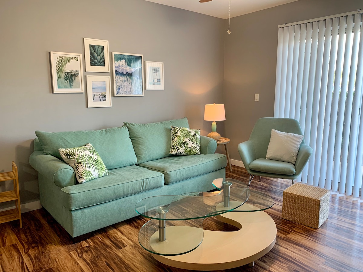 ***Beach service at our private beach for 2 included**** A beautifully decorated studio condo that sleeps 4 comfortably. It includes a queen size bed and queen size sleeper sofa with a memory foam mattress. Not to mention a breakfast bar and 55” TV with surround sound. You can stand on the back deck and see views of the sugary white sand beaches that are right across the street from our place. Beach service at our private beach for 2 included.