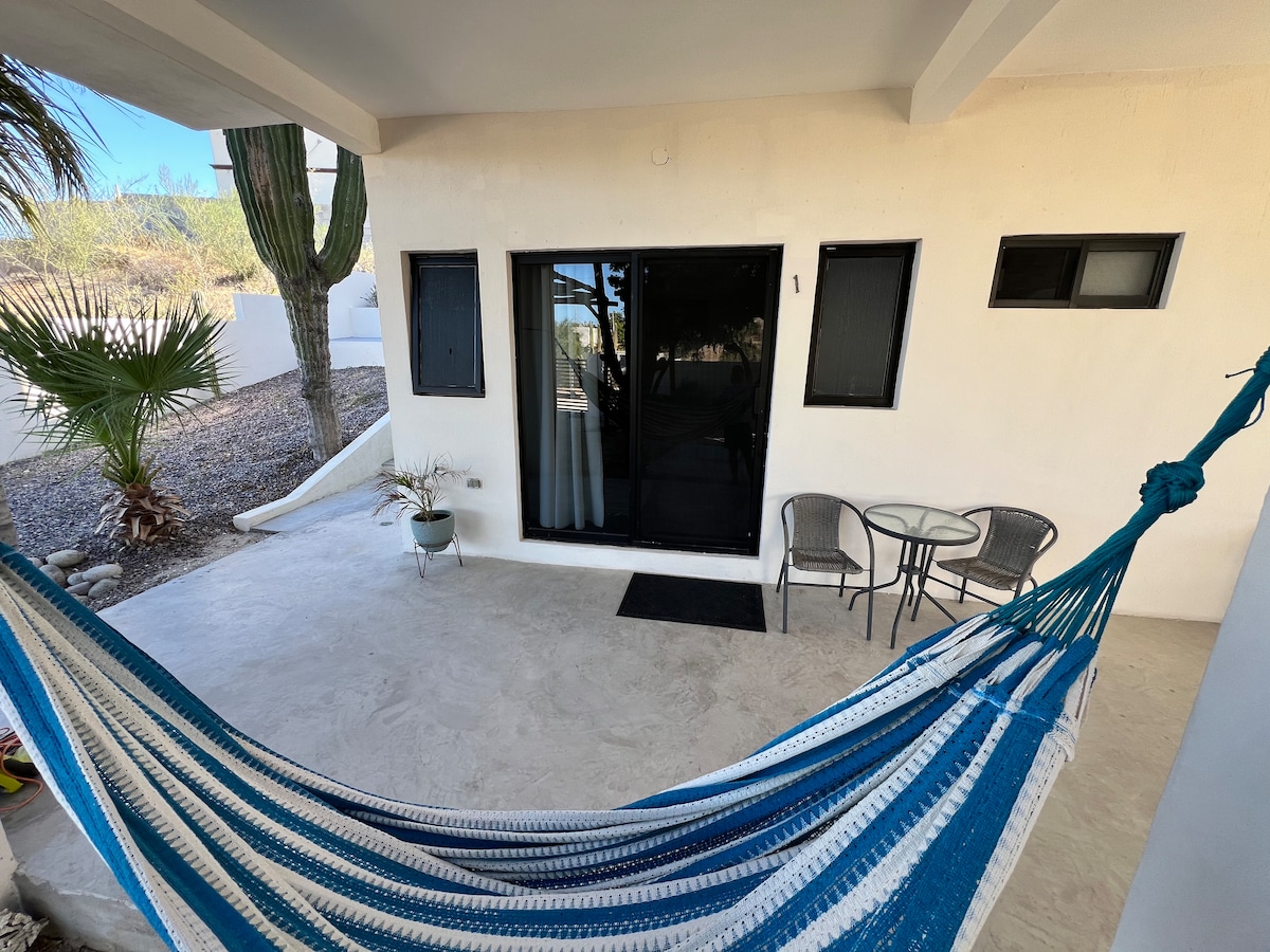 Moderna casita tipo estudio en La Ventana, BCS, perfecta para estancias relajantes. Equipada con WiFi de fibra óptica, cocina completa, cama queen y sofá cama. El baño cuenta con excelente presión de agua y agua caliente. Incluye área de lavandería para mayor comodidad. Ubicada a solo 5 minutos de la playa y cerca de restaurantes, tiendas y actividades de kite surf, wingFoil & Windsurf. Ideal para disfrutar de la tranquilidad y las atracciones locales.”
