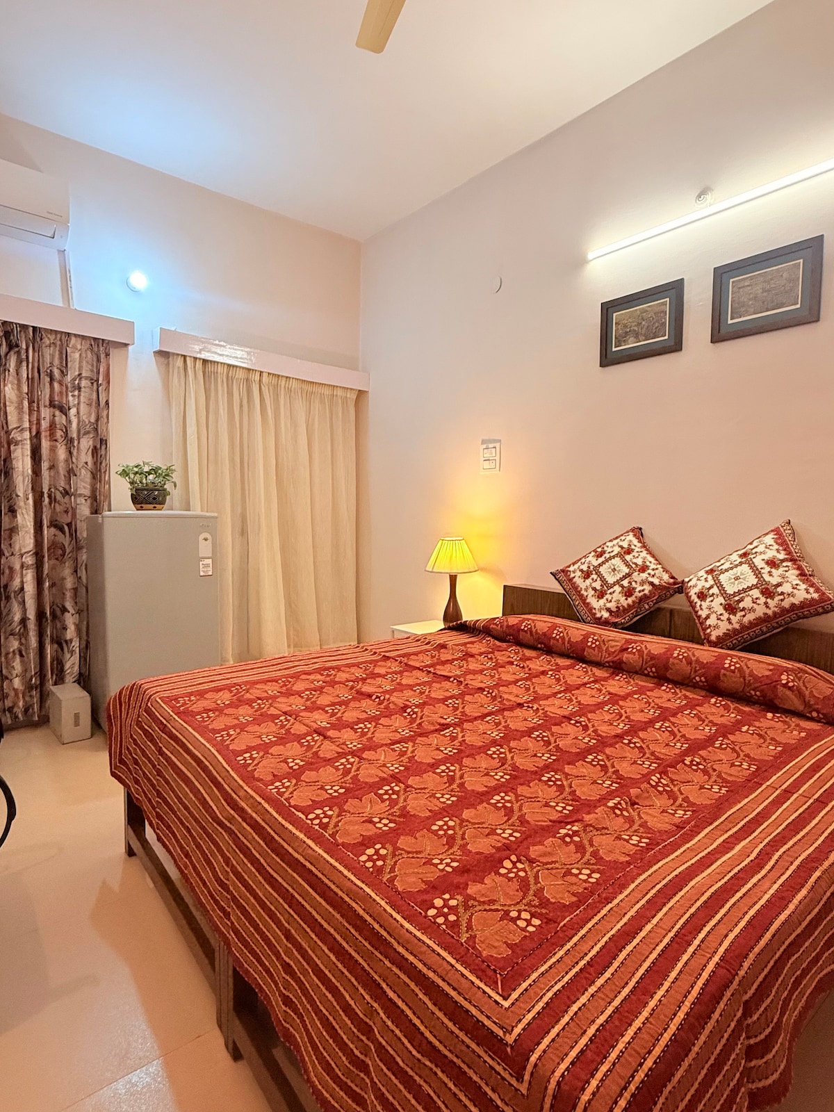 Step into a space where earthy charm meets modern comfort. Nestled in a peaceful, family-friendly gated neighborhood, Studio Sienna is a cozy 2BHK apartment designed for slow living, creative vibes, and warm hospitality. Located on the 2nd floor, the apartment is drenched in natural light and styled with a warm terracotta palette, the interiors are filled with handcrafted decor, rustic wooden textures, vintage finds, and original artworks thoughtfully chosen to make you feel instantly at home.