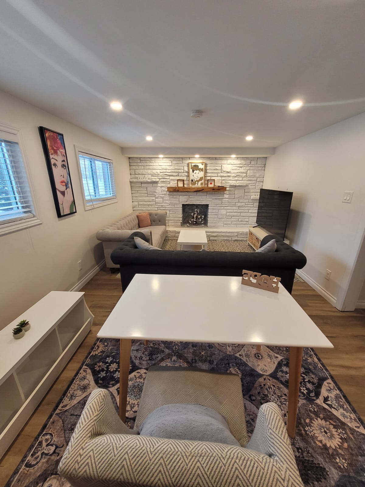 Make some memories in our quaint town and stay at our unique family-friendly home with a private indoor heated salt water pool & hottub in the basement. The pool room has a TV, air hockey table, Foosball and basketball game. The fourth bedroom doubles as a board and Video games room/gym and there is a hockey training center on the garage. The fenced backyard has a deck, propane BBQ and seating area, movie screen & projector, trampoline and fire pit (firewood provided). Fun for the whole family!
