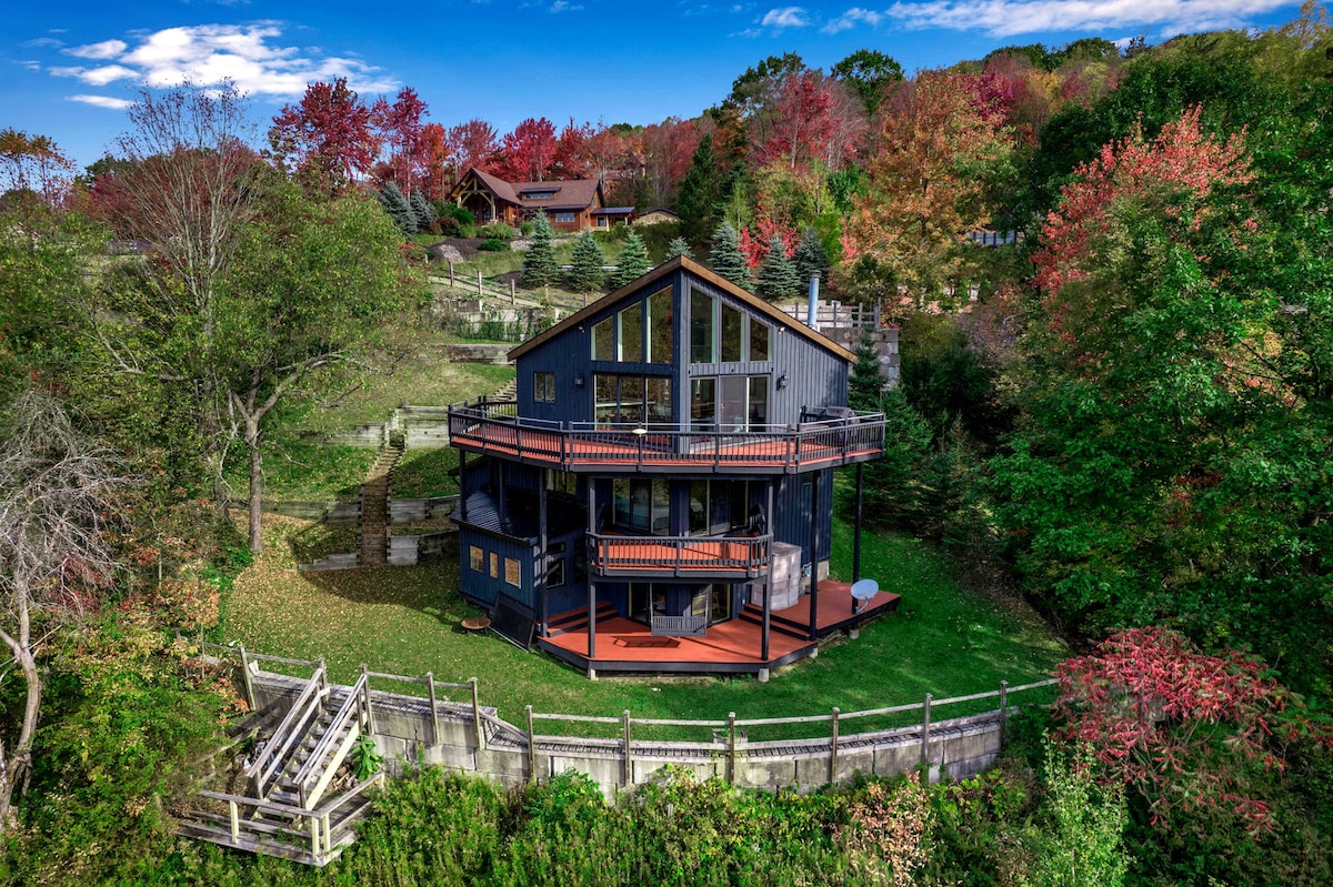 Escape to this modern, custom-built home just minutes from Holiday Valley and Ellicottville. With stunning views, multiple living spaces, and year-round amenities, this spacious retreat is perfect for families and groups looking to relax in comfort and style. 🛁 Hot Tub – Relax under the stars 🔥 Wood Stove & Fire Pit – Cozy indoor & outdoor 🛏 Sleeps 12 – Spacious & comfortable stay 🌿 Wrap-Around Deck & BBQ – Outdoor dining & lounging 📶 WiFi + Smart TVs – Stay connected 🔋 L2 EV Charger