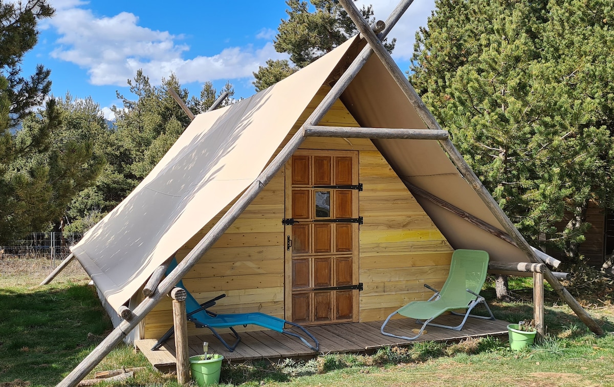 Drôle de tente aux allures touareg, la Lotus peut accueillir 4 à 5 personnes (1 lit en 160*200, 1 lit en 90*190 et un canapé convertible en 120*190). Sa décoration éclectique, ses fenêtres offrant un vue sur le ciel, sa forme basse et enveloppante en font une petite bulle protectrice. Sa terrasse en bois de 25m2 profite d'une belle vue sur les montagnes environnantes. Bienvenue à la maison! Sanitaires sympas et cuisine d'été partagée à disposition pendant votre séjour!