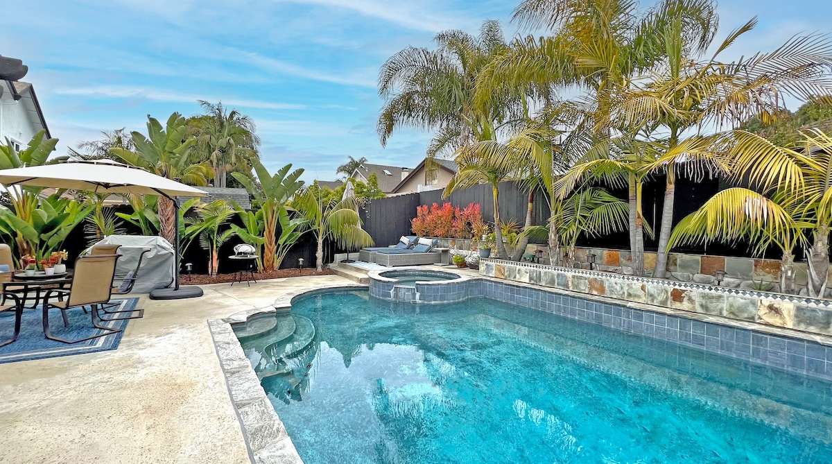 Soak up the Southern California sun at this serene 3BR, 2BA oasis in Encinitas. Just ½ mile to the beach and Hwy 101, this private Leucadia retreat features a resort-style waterfall, pergola with swinging chairs, and a sun-soaked patio for relaxing or dining outdoors. Inside, enjoy plush beachy-boho interiors perfect for unwinding after days spent exploring Encinitas, La Jolla, Carlsbad, LEGOLAND, and more. Designed for effortless indoor-outdoor living and unforgettable coastal nights.