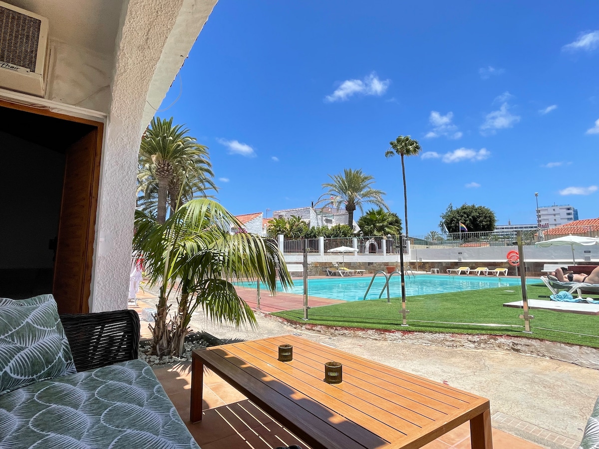 En pleno corazón de Maspalomas, a tan solo 3,5 KM de las dunas de Maspalomas y a 1,2 KM del Campo de Golf, se encuentra este precioso bungalow donde podrás relajarte y tomar el sol los 365 días del año. Completamente reformado, la estancia cuenta con un amplio dormitorio, salón-cocina y baño. Parcela con un amplio jardín privado de 70 m2 donde podrás disfrutar de cómodas tumbonas, zona chill out, barbacoa y ducha exterior. El bungalow tiene aire acondicionado.