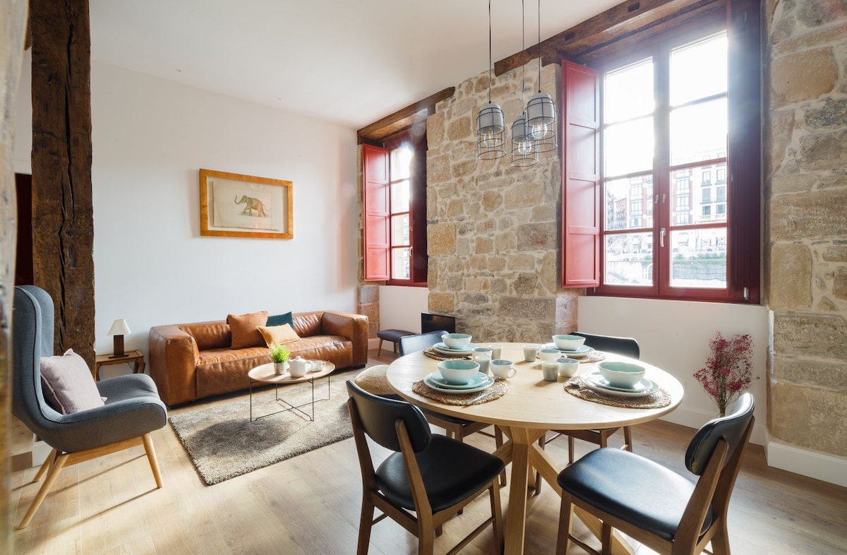 Feel the real Bilbao experience living in one of the most ancient streets in Bilbao, heart of the culinary, cultural and social life. Disfruta del confort del suelo radiante. Piso moderno y elegante, recién reformado está ubicado en el corazón del casco viejo con los mejores restaurantes y comercios de la zona, la casa dispone de dos cómodas habitaciónes con cama Queen Size de 150cm, un moderno baño completo, una cocina de concepto abierto a un área de comedor y sala de estar muy funcional.