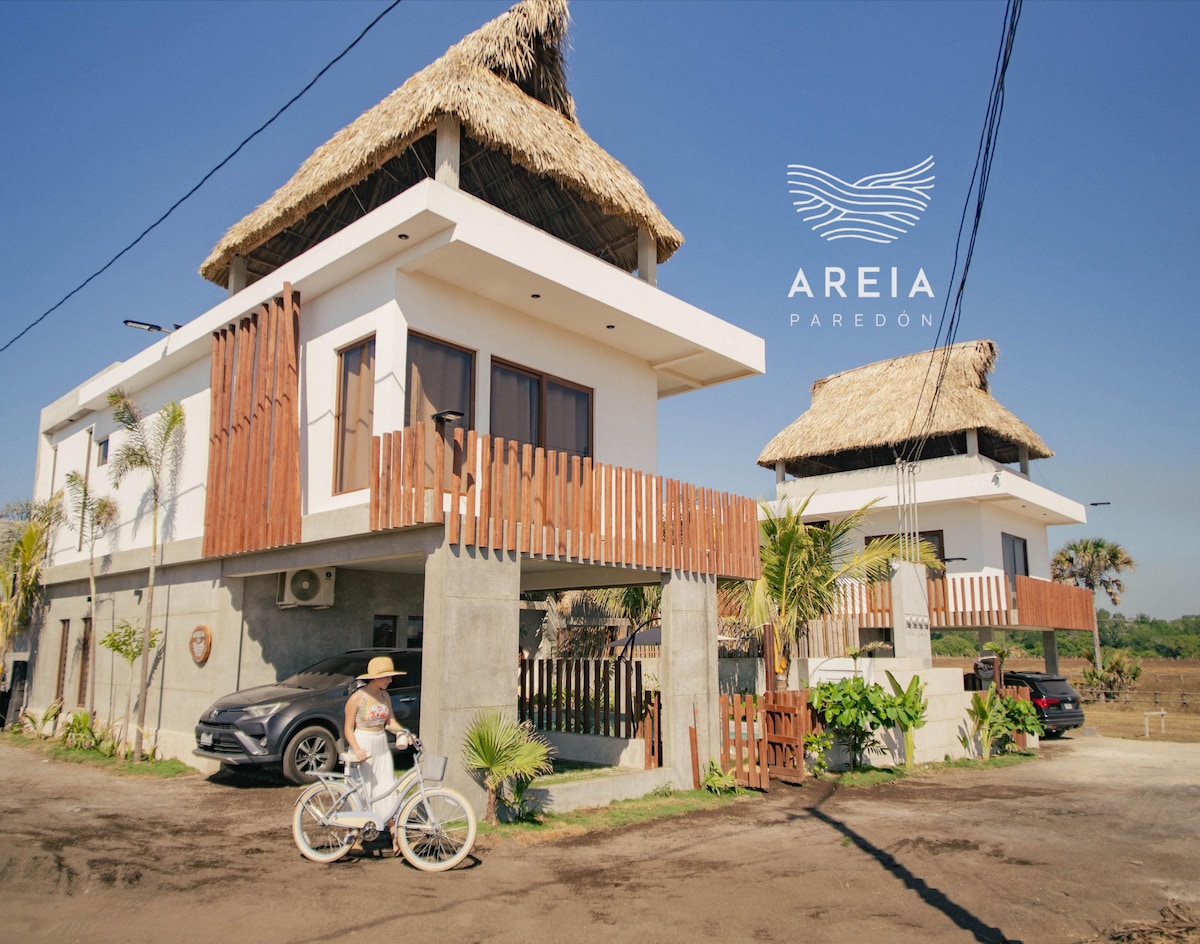 Awaken your spirit by the sea. Nestled in El Paredon, Guatemala. This private 2-bed, 2-bath haven intertwines modern comfort and rustic charm, a short stroll from the beach. Embrace practicality with a well-equipped kitchen, hot showers, a sleeper sofa, & agua vida on tap. Immerse yourself in serenity on the poolside or terrace, enjoying the afternoon breeze with air conditioning as an optional companion. Our unique dwelling offers a space for tranquility, find solace by the soothing waves.