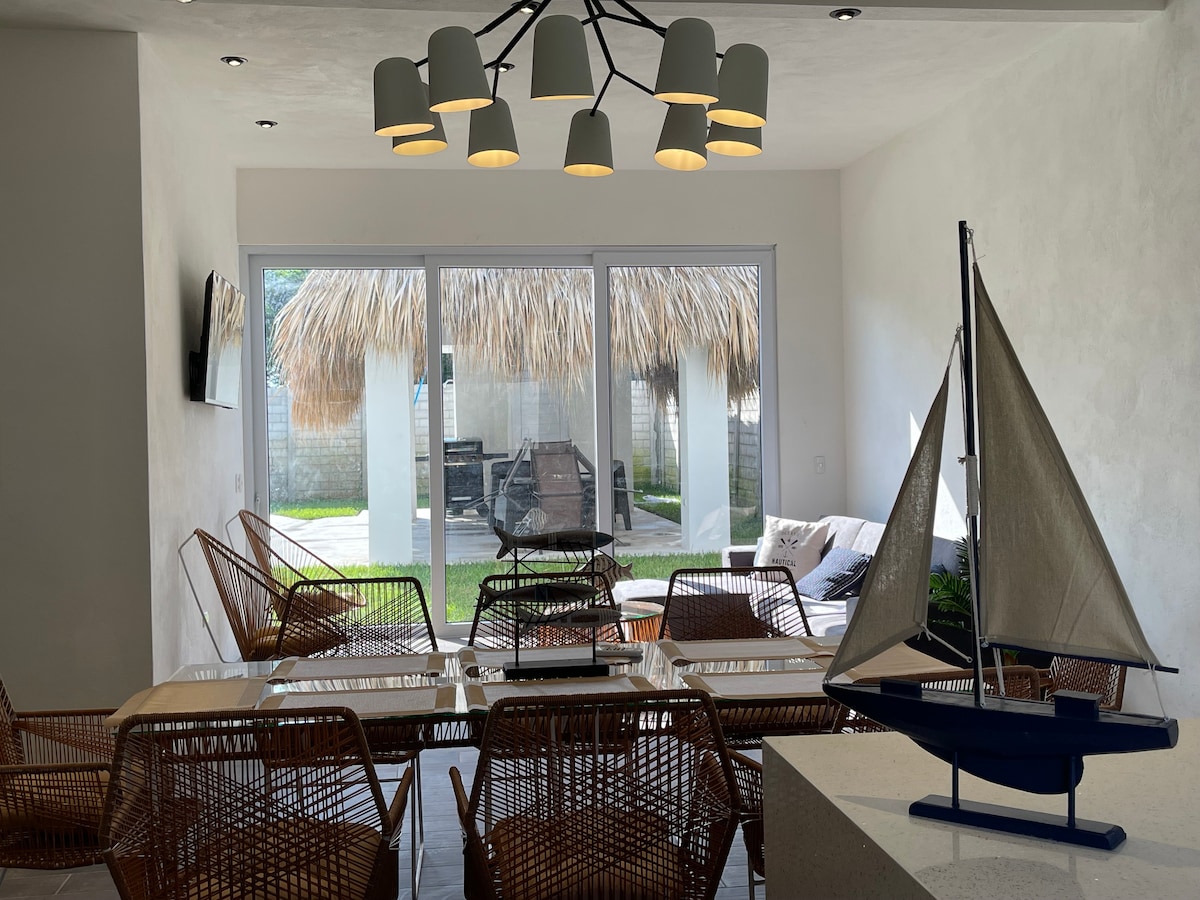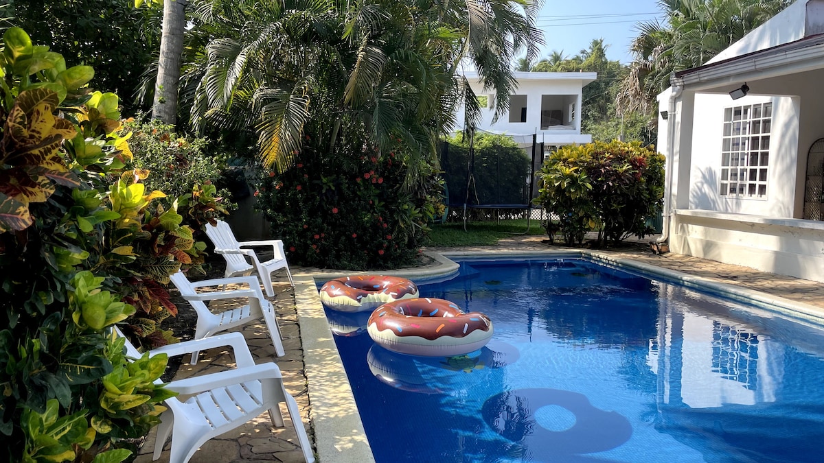 Comfortable and cozy complete house for 9 people, air conditioning in each room, private pool, less than 5 min. of the beach. Master bedroom w / bathroom, TV / cable and king size bed. 2 bedrooms share the second bathroom. Third bathroom in the pool area. Towels, paper, soap and shampoo / conditioner are provided. Equipped kitchen, living room with TV / cable. Hammocks, grill (utensils are provided). The house is located in a totally safe residential area. Wifi available.