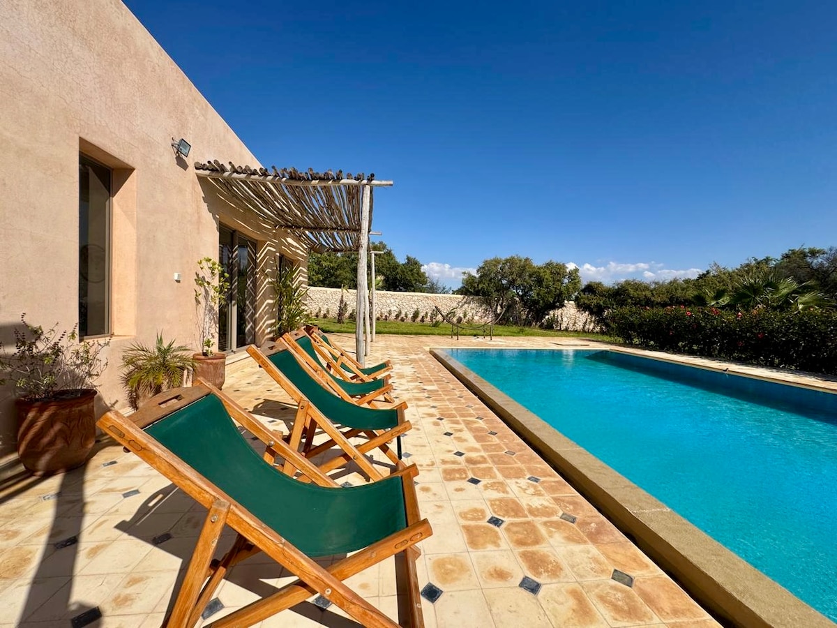 Charming Family Villa, 2levels, independent, spacious, well illuminated, a big private pool of 75m² and a beautiful garden. Located on the countryside, 16km from Essaouira on Sidi Kaouki rd, it has a luxurious finish, chimney, open fire place in the garden, olive and fruit trees and two beautiful Terraces with pergolas. Modern and peaceful. Airport at 6.5km and shops and a supermarket at 10min. You will need a vehicle to get around.