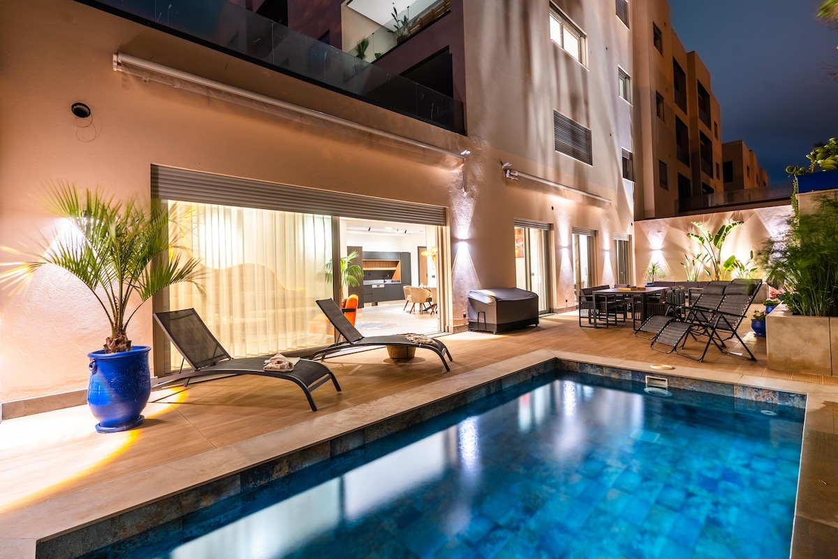 Ce magnifique appartement neuf est une bulle de silence dans l'effervescence d'Essaouira. Il peut accueillir 5 personnes et 1 bébé et jusqu'à 6 personnes avec un canapé lit dans le salon. Idéalement situé à 5 secondes de la plage et 15mn à pied de l'authentique Médina il est spacieux 230m2, calme, joliment meublé avec goût et luxe. Il a une grande terrasse avec piscine privée dans une atmosphère unique et un parking privé souterrain. Notre co-hôte Nezha vous accueillera avec professionnalisme.