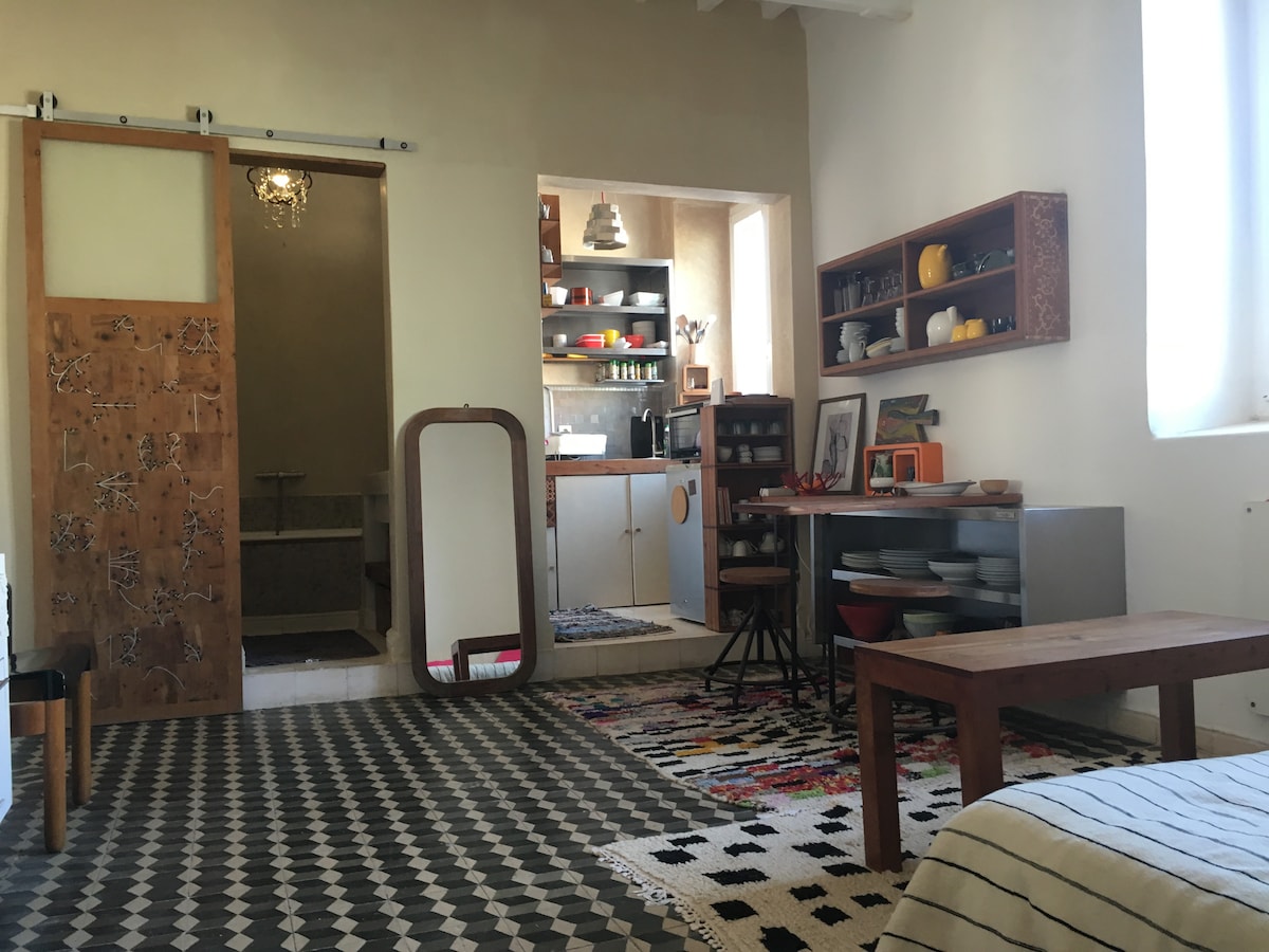 Studio atypique et lumineux sur un grand rooftop féerique privée, au sommet de La Casa Guapa. Chambre cosy avec lit king-size, salle d’eau, cuisine extérieure en bois sous pergola, vue sur la médina et l’océan. Idéal pour une escapade à deux, au calme, en pleine lumière dans un lieu magique et atypique. Coin repas, transats, Wi-Fi. Situé dans un quartier authentique et vivant, à moins de 10 min de la plage et 20 min de la Médina. Services sur demande : transferts, massages, activités...