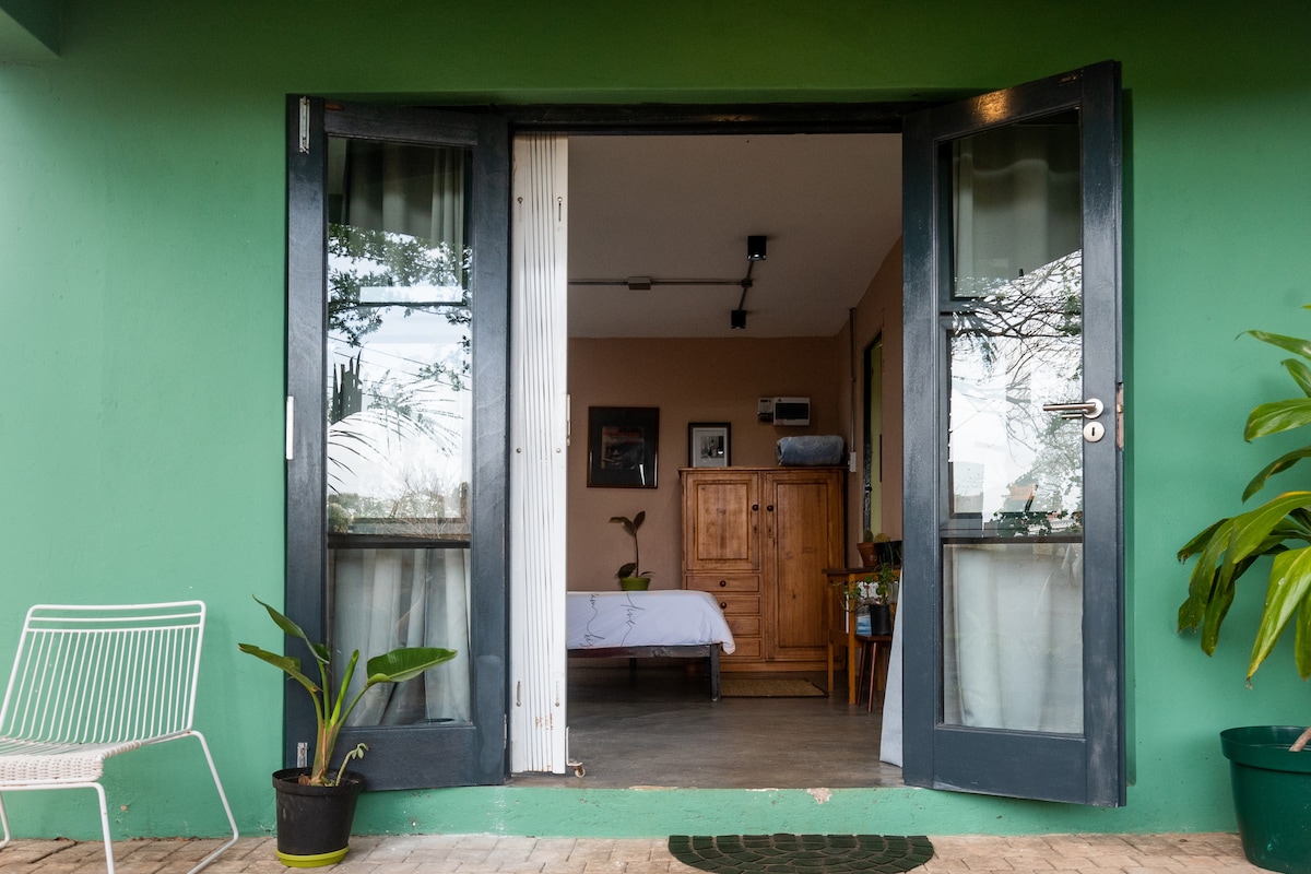 Welcome to this self contained unit with a sufficiently equipped kitchenette. A open-plan ground level unit that can comfortably accommodate a couple. This airy unit is tucked away with its own entrance out of view from the other units & main house. The property and area is lush and peaceful. The unit has unique finishes and honest in its making. It has a foldable eating or work desk, painted in mild-pink and warm teal with bathroom in lime. The unit is occuppied by plenty indoor plants.