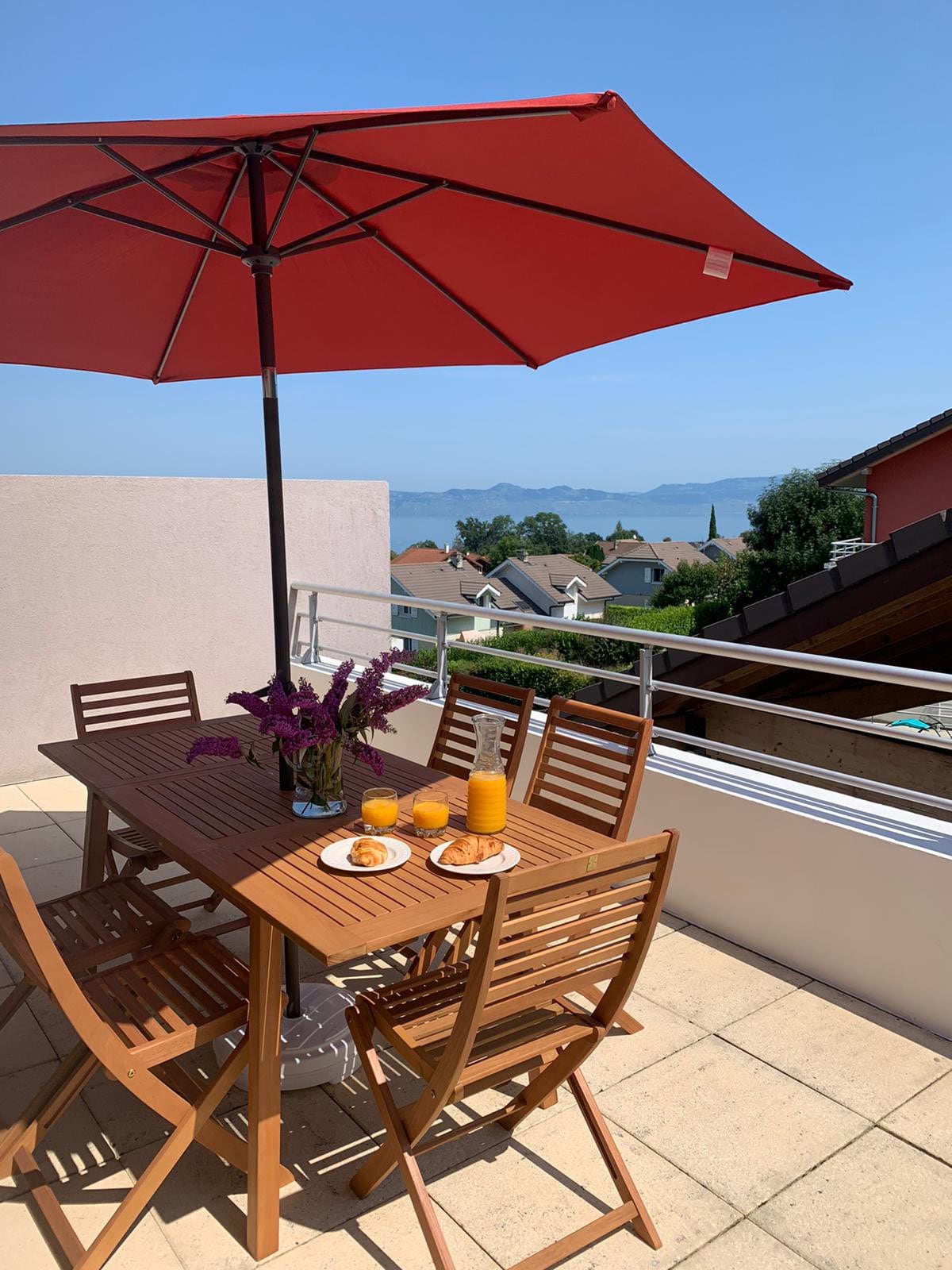 Beautiful flat of 110m2 with two bedrooms, a private garden, terrace and spacious veranda. It also has a large living room and a beautiful dining room/kitchen. The place is tastefully decorated. The view is panoramic on the lake and the mountains. The entrance to the A9 motorway is 3 minutes away. Many walks in the Lavaux vineyards are possible directly from the house. 5 minutes away from the beach of Rivaz (Lake Geneva) and 30 minutes from the mountains!