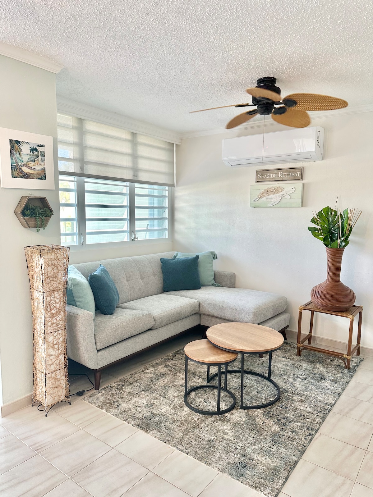 Is a private island, Is a beautiful island but you have to get a 5 minutes trip from Fajardo . With a free Ferry transportation from 6am to 11pm , building with all the amenities , 3 pools, volleyball, basketball & tennis court, 360 beach view. You can do kayak, snorkeling, fishing. Also get a rental boat and get trip to palomino or Icaco. Paid parking $5daily with security guard The AC is at the room and living room ****Ask me about the private boat charter offers**