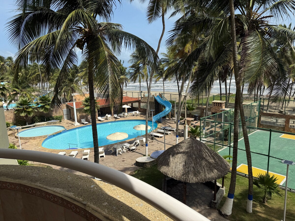 海滩上的公寓。游泳池、空调和WiFi。
