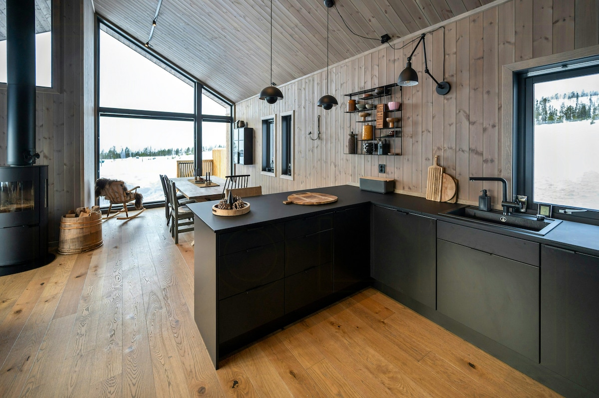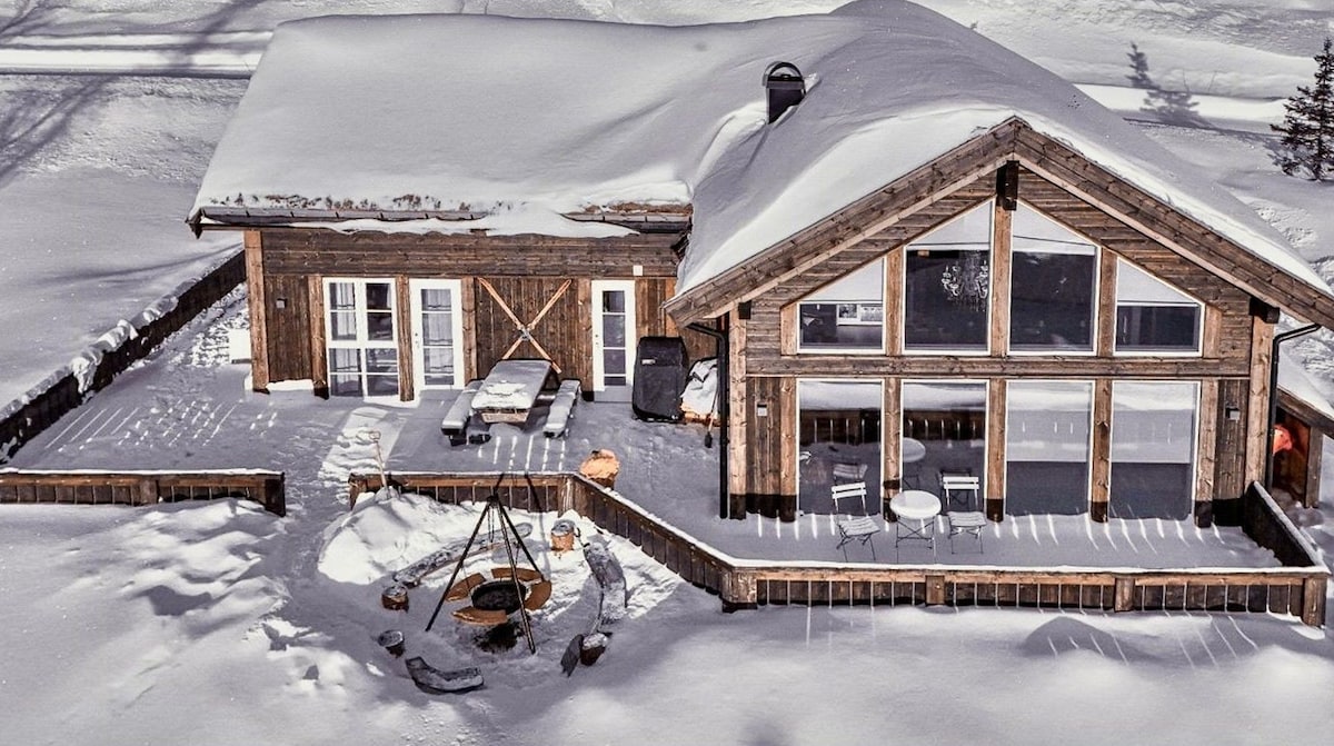 Unik hytte fra 2020, spektakulær utsikt og jaccuzi. 13 sengeplasser, to bad, meget høy standard og velutstyrt kjøkken. God plass til 2-3 familier. Alkove i stua til lesing eller gaming. Vi låner gjerne ut spill, leker og PlayStation. Bålpanne, vedfyrt pizzaovn og koselig grillplass finnes rett utenfor hytta. Hytta er sørvendt med sol hele dagen, og nydelig utsikt over fjellheimen. Store vindusflater som slipper utsikten inn, og håndmurt åpen peis i stua.