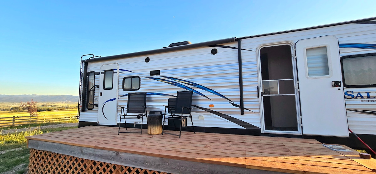Discover the gorgeous landscape that surrounds this place to stay. 27' Camper nestled inside a Kiko goat farm with gorgeous Mission Valley Mountain views. The trailer has a comfortable queen sized bed, fully equipped kitchen and fridge. A great view of the Mission Mountain range in the living room. Private shower and toilet. Has AC/ Heater if needed. Kitchen utensils, essentials and toiletries included.