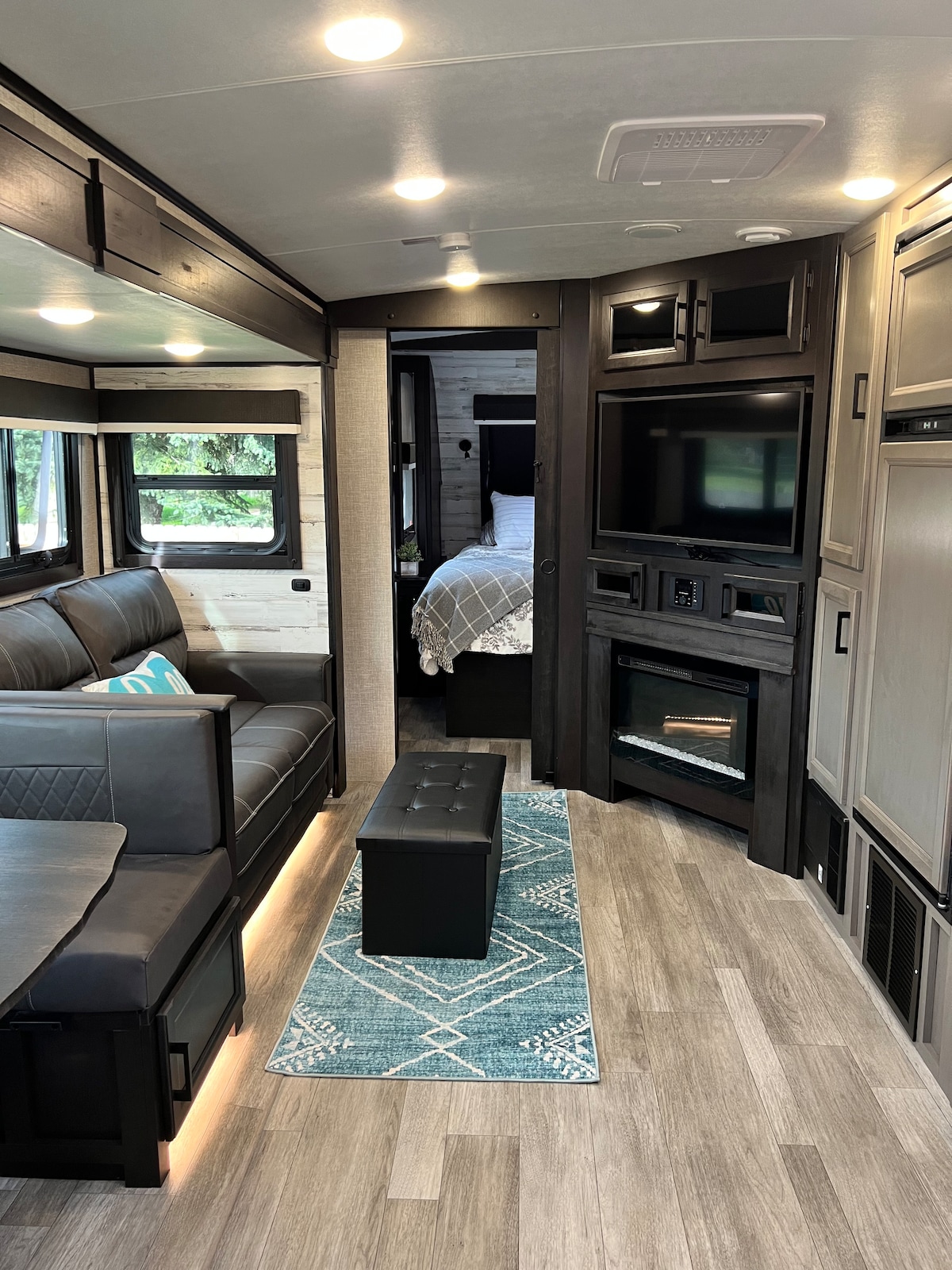 New RV with slide out dining and living is clean and cozy, and has everything you need for a comfortable stay: full kitchen, full bath, master bedroom with closing door, full over full bunks, fireplace, TV, outdoor picnic area and Weber BBQ. The RV is set back on the property, behind other residential units and adjacent to another campsite. It sits behind a large garage and adjacent to a chicken run in an open setting, but there is as much privacy as you’d have at a campground.