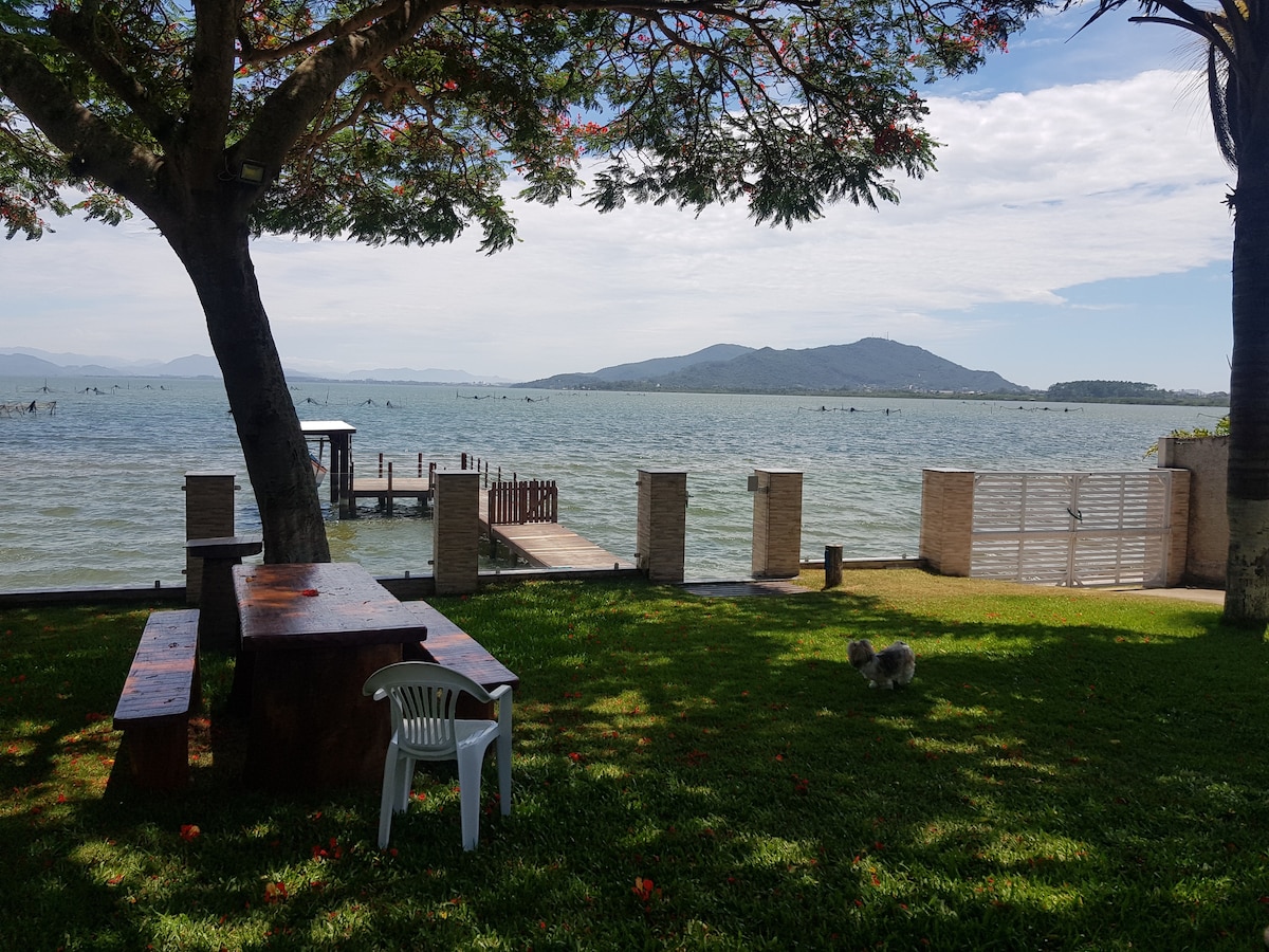 Relaxe casa à beira da lagoa, Barra da Lagoa. Quartos: suíte no andar superior, com 1 cama de casal e 1 de solteiro, com vista completa da lagoa e quarto no térreo, com 1 cama de casal e 1 bicama. Ar cond. todos ambientes. Quiosque com churrasqueira (climat) frente à linda piscina, pergolado com sofá rústico, espreguiçadeiras e amplo gramado com redário e fogodechão em frente à lagoa da Conceição! Cozinha completa, com sala integrada com vista da lagoa. Garagem. Obs: Réveillon 8 diarias mínimo.