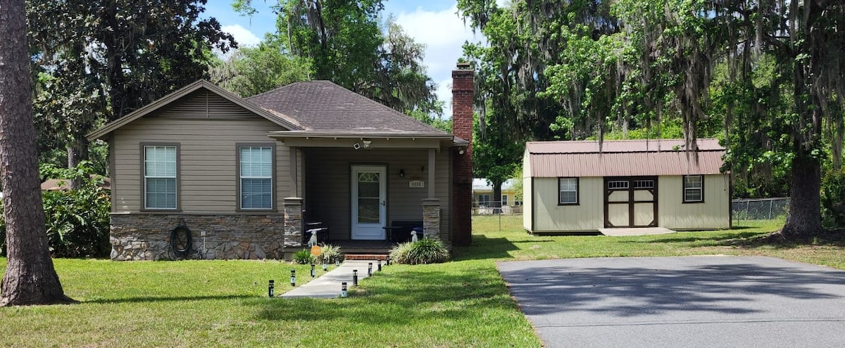 Make memories with the ones you loves at this unique Countryside loft feeling cottage with an elegant mix between rustic and modern aesthetic. We are a pet friendly Cottage, bring your furry friend and enjoy the coziness. This is a family wood gated compound. Each cottage are private, surrounded by beautiful común areas. Surrounded by a lot of natural springs and also the convenients of local restaurants like “Gators Joes Beach Bar & Grill” at just 6m walk, 6m walk to Lake Weir, and more.