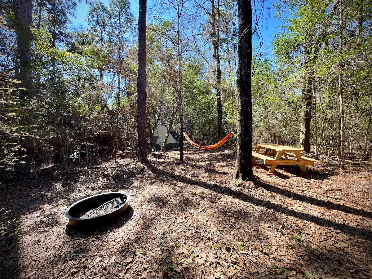 This is a walk in only PRIMITIVE site. YOU WILL NEED TO BRING A TENT. WE DO NOT PROVIDE ONE. Down a hidden gravel drive with wetlands on either side you will find a completely fenced in field surrounded by pine, oak, and swamp maple trees. There are two ponds located on the property both stocked with bass, bluegill, and sunfish. The front pond is home to many natural Florida wildlife and is a great location to bird watch. . . Charcoal grills are provided in the BBQ area.