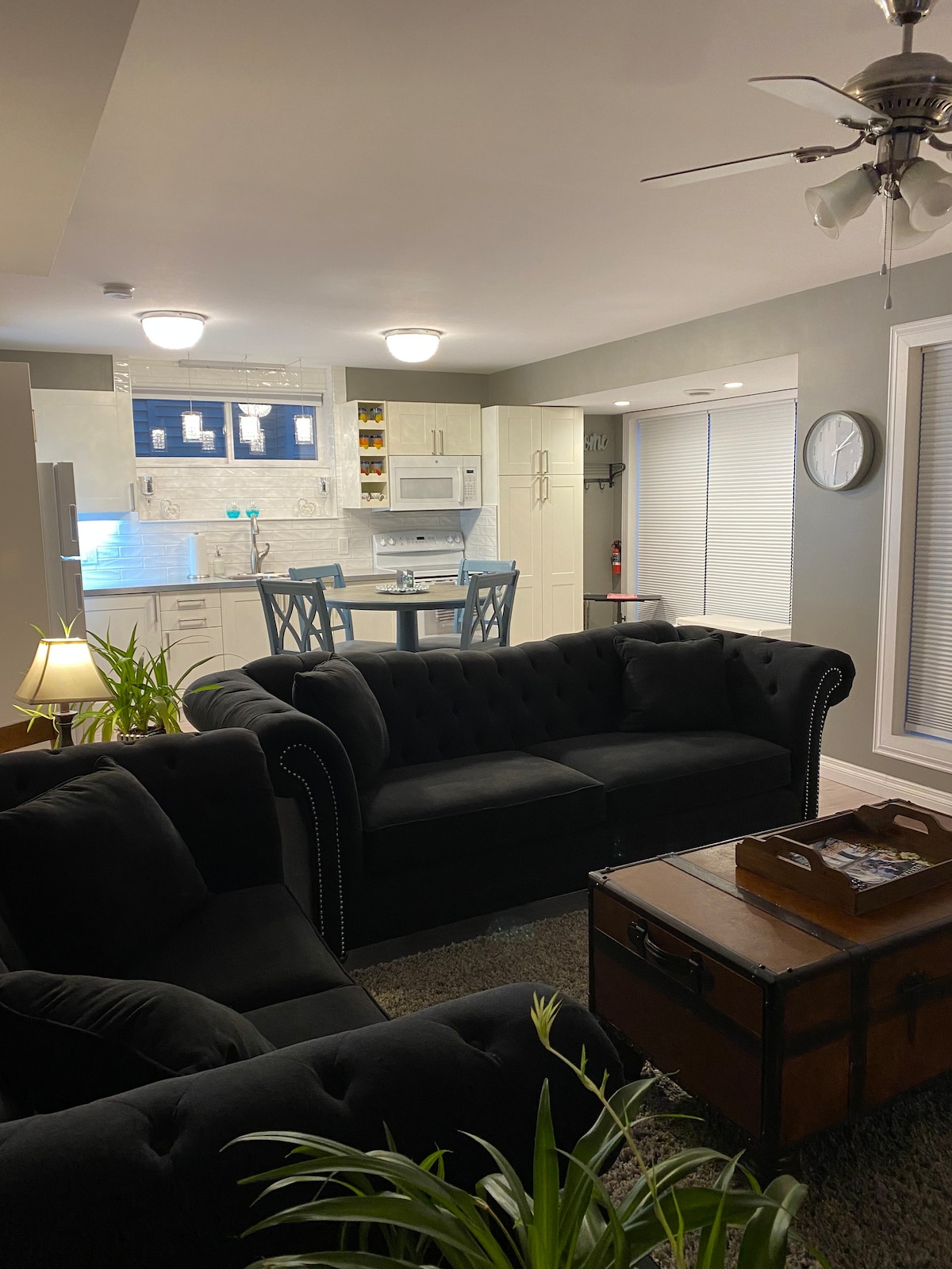 Come and stay in our luxury two bedroom, 1 bathroom lower level retreat. You will be instantly greeted with a cozy living area and stylish decor. Cozy up to a modern crystal fireplace and a comfortable large reclining leather sectional, while you enjoy watching a 80” smart theater TV. We offer a side bar with coffee station, microwave and fridge and freezer. There are 2 large bedrooms and walk-in closet with plenty of storage. The king size tempur pedic bed is absolutely heavenly.