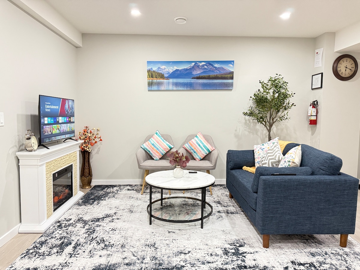 Come and stay in our luxury two bedroom, 1 bathroom lower level retreat. You will be instantly greeted with a cozy living area and stylish decor. Cozy up to a modern crystal fireplace and a comfortable large reclining leather sectional, while you enjoy watching a 80” smart theater TV. We offer a side bar with coffee station, microwave and fridge and freezer. There are 2 large bedrooms and walk-in closet with plenty of storage. The king size tempur pedic bed is absolutely heavenly.