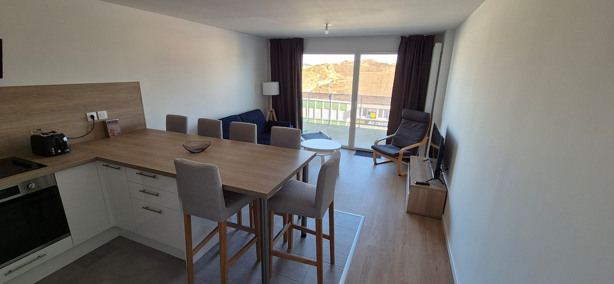 Situé sur la place principale de l’écovillage Pierre et Vacances, village Belle Dune, nous vous proposons notre appartement de 35m². Celui-ci est situé au premier étage avec une vue exceptionnelle sur le lac L’appartement est composé : D’un hall d’entrée D’une cabine avec lits superposés D’une salle de bain WC D’un séjour avec cuisine ouverte, avec canapé-lit 2 places 2 balcons de 7m² donnant sur l'espace aquatique et sur le lac La piscine Aquaclub est ouverte! Entrées non comprises.