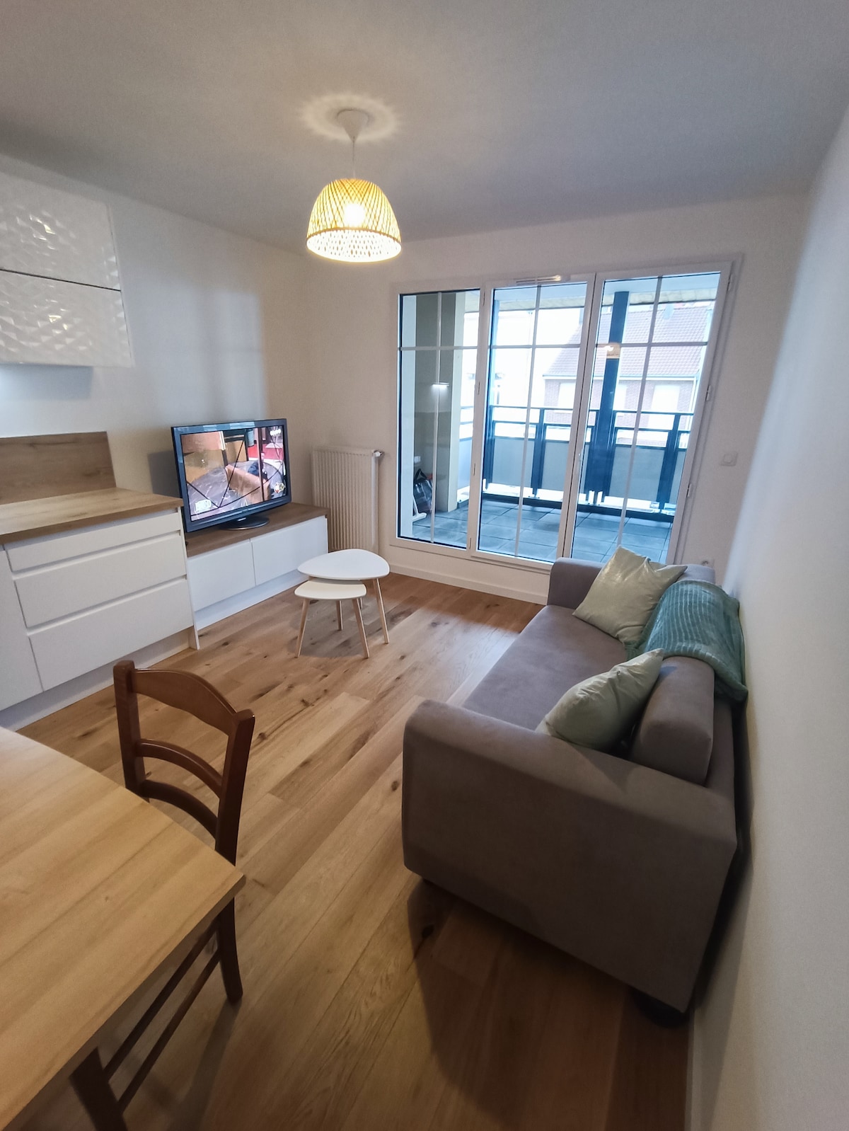 Appartement à Fort-Mahon-Plage pour 2 à 4 pers 1er étage - 1 chambre avec lit double - canapé-lit matelassé - télévision - cuisine équipée avec four et micro-ondes, cafetière (filtre), grill-pains - salle de bains avec douche à l'italienne - WC indépendants