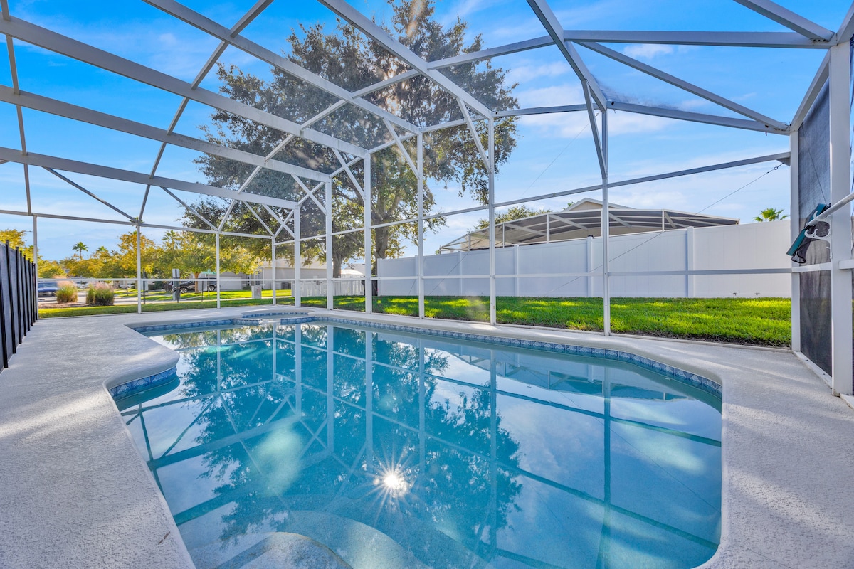 Spacious 4BR/3BA Pool Home Near Disney! Welcome to Lando Haus by Magic Camden: a 4BR, 3BA retreat with a private screened saltwater pool, just 25 min from Disney. Over 2,000 sqft of comfort with smart TVs, fiber WiFi, full kitchen, dining, washer/dryer & more. Sleeps 8+. Professionally managed with community support. Relax and unwind in a clean, family-friendly space close to shops, golf, and Orlando attractions!