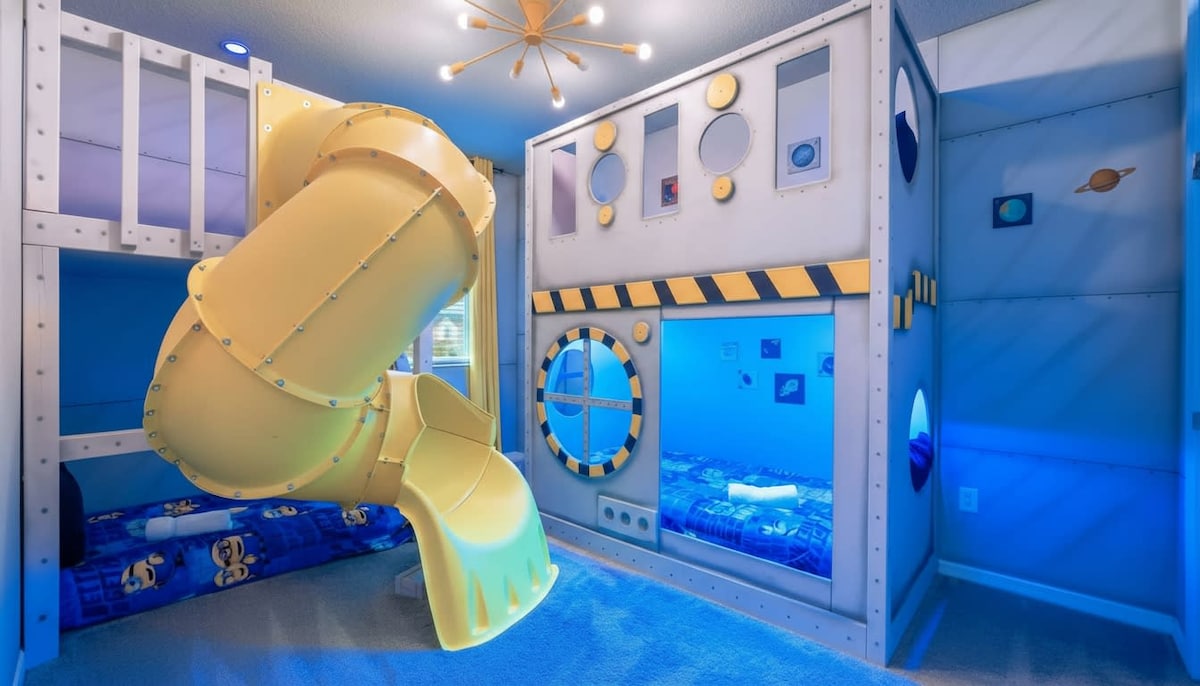 Location can't get better! Next to Disney Parks and Restaurant Row! This Guarded and gated place to stay is perfect for family trips. You will fall in love with our year round 12ft tree tastefully decorated by season. Mickey's Camping room, Frozen themed room, the cabin Christmas year round experience & 2 additional modern king rooms perfect for couples! Did I mention the stunning Avengers Home theater/game room and oversized pool?