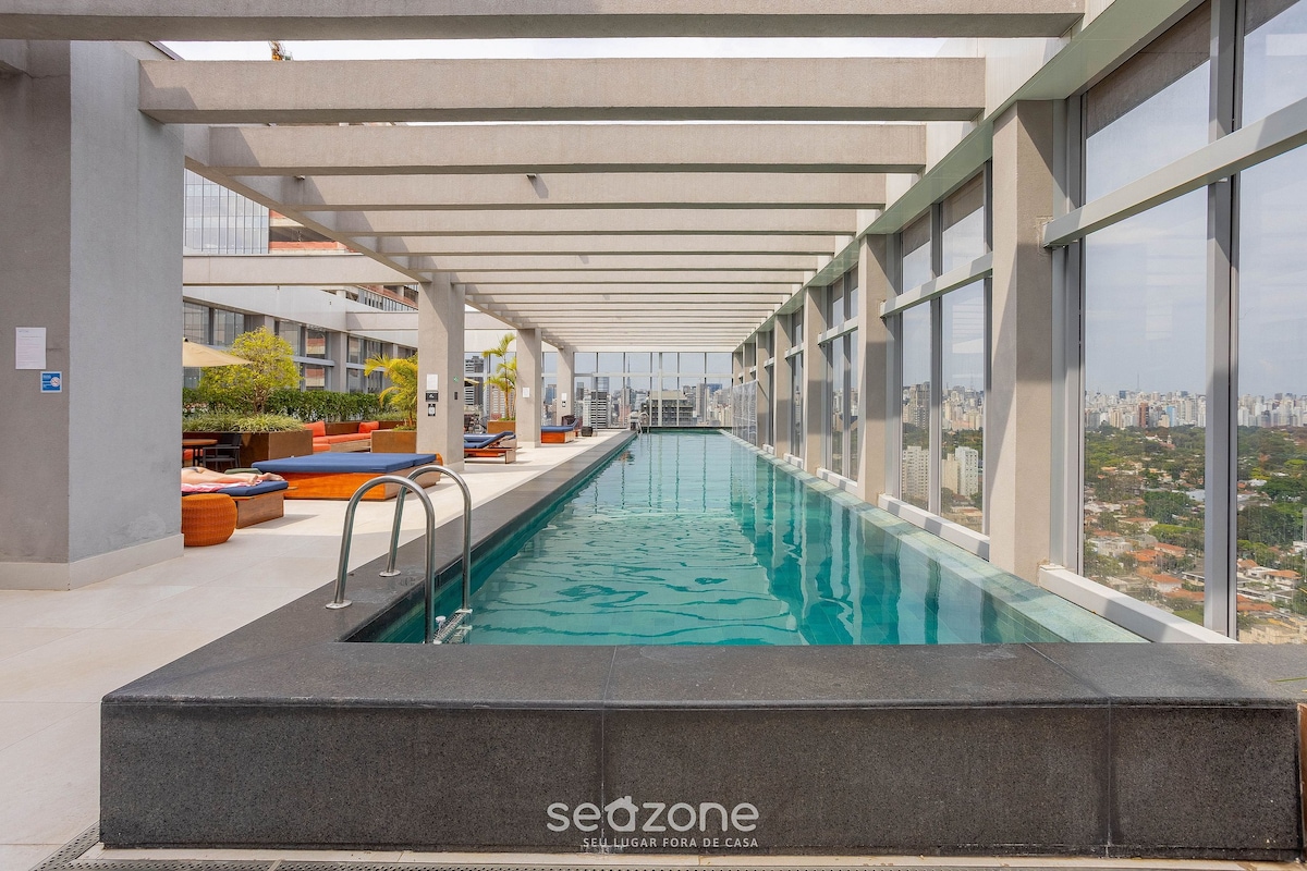 Apartamento com serviço de camareira, muito confortável, em Pinheiros, "na rua mais cool de São Paulo", próximo ao metro Fradique Coutinho. Ao chegar de viagem em São Paulo, considere a ideia de nadar na piscina do terraço. Se quiser sair para comer, lembre-se que você está num bairro com ótimas opções de restaurantes e bares. A vista é simplesmente incrível de toda a região pela janela do quarto, inspiradora e magnífica. Smart TV, Netflix, Prime Video, Youtube e muito mais. Loja 24h no subsolo