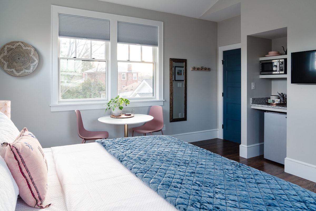 Kick back at The HiTop, a bright upstairs suite in walkable West Asheville — near Haywood Rd’s shops, restaurants, and breweries, close to the River Arts District, and a quick Uber to downtown. Enjoy a queen bed, coffee bar, mini-fridge, microwave, smart TV, spacious bath, and a private rooftop deck. Includes entrance, parking, and bike storage. Adjacent to Haylo if traveling with friends. We love kids, but the HiTop isn’t child-friendly and sound travels, so it’s best for adults.