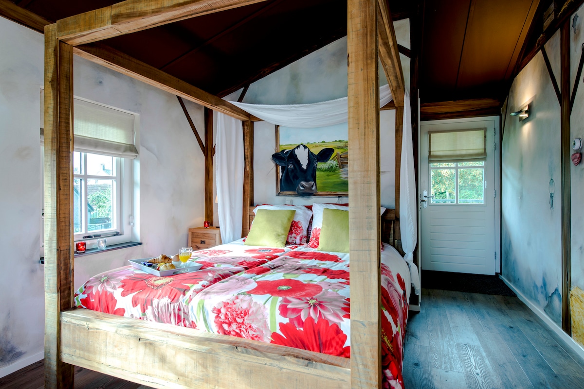 Ontspan en kom tot rust in deze vredige, stijlvolle ruimte met uitzicht over de weilanden en bos. The Barn is een luxueus guesthouse achterin de boerderij bij ons op het erf, heerlijk rustig gelegen buiten het dorp. Compleet ingericht met keuken, badkamer, living en 2 slaapkamers. 1 op de vide en 1 aparte slaapkamer beiden met een groot 2 pers. bed. Op de vide is een stahoogte van 165 cm. Met privé tuin, terras en aparte afgesloten overkapping met houtkachel en jacuzzi. (optioneel) zie regels.