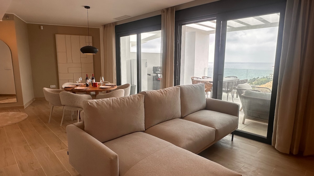 Wake up to breathtaking panoramic sea views in this stylish 3-bedroom, 3-bathroom luxury retreat in Las Lagunas de Mijas. Just steps from the beach, this modern sanctuary offers an expansive terrace, a sleek open-concept living space, and resort-style amenities for the ultimate Costa del Sol getaway. ✔ Spectacular ocean & mountain views from the living area & bedrooms ✔ Resort-style pool, sauna & free gym ✔ Fully equipped kitchen & spacious dining area ✔ Private terrace ✔ Fast Wi-Fi & SmartTV