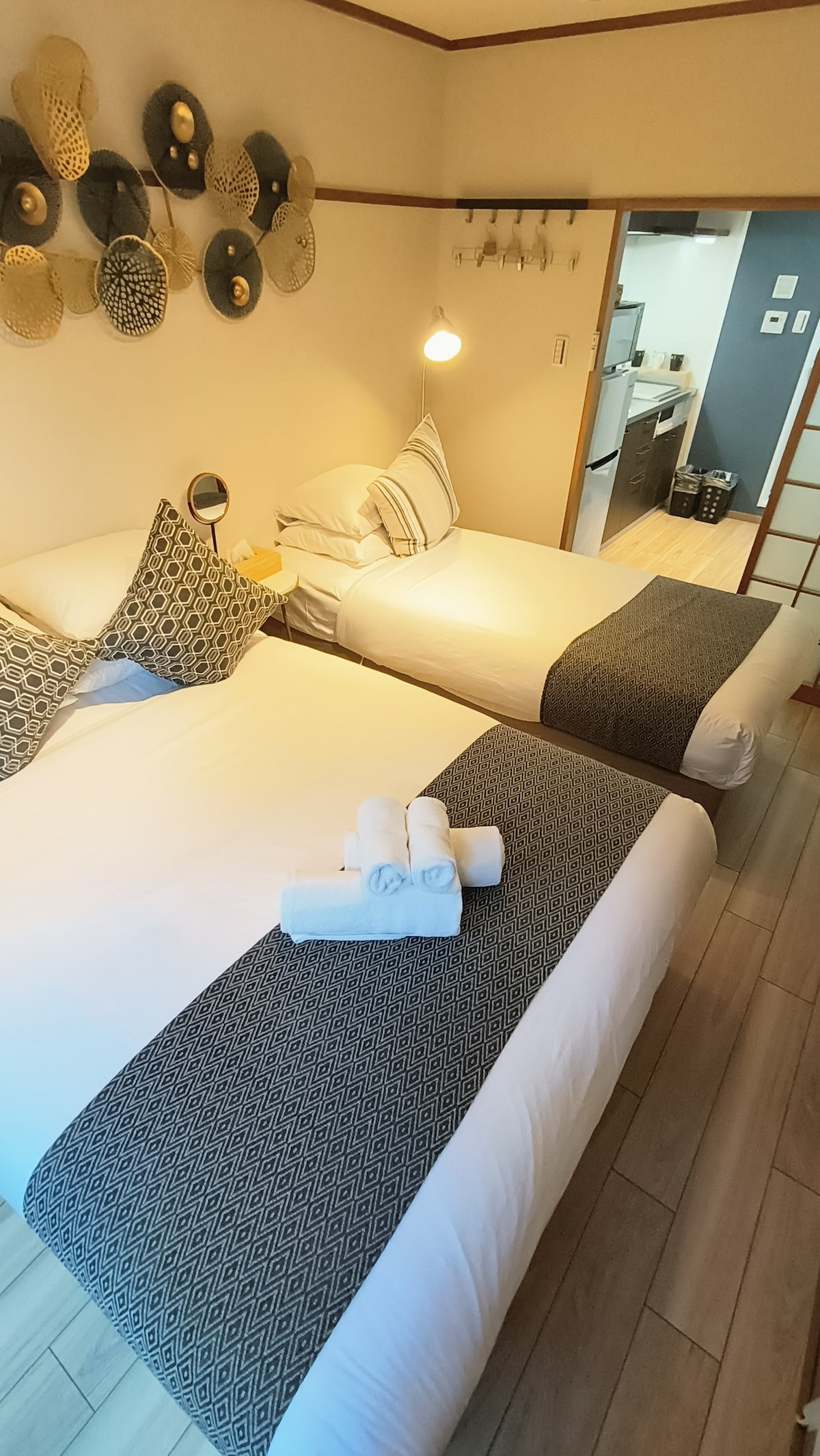 嗨,大家好! 我们的民宿全新装修!整洁豪华舒适!生活设施便利! 和服租赁,生活超市,便利店,咖啡厅,日式餐厅都在步行距离。 【简介】独立房间,温馨舒适,2层木制豪华别墅 【交通】京阪电车和JR电车,6分钟以内可以到达祗园,清水寺和京都车站。 民宿位置优越,风景优美,您一定会爱上我们的家。 【Introduction】 Fantastic and picturesque Japanese Villa! Which makes you a wonderful memory of Japanese tour! 3 rooms: 2 twin beds, 3 tatami Japanese beds , comfortable rooms with beautiful city view. 【Location】 1 minute walk to Fusimiinari temple ※ 1 bathroom, 1 kitchen