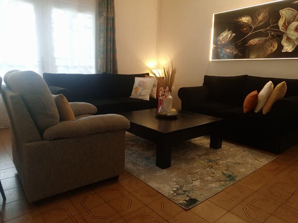Appartement meublée tout confort à Okala carrefour l'auberge, 2 chambres, 2 douches, 2 wc, à 10mn de l'aéroport. Accès direct sur le goudron. Quartier sécurisé et résidentiel, l'appartement se situe à proximité de toutes les commodités... WIFI disponible, Canal SAT, climatisation dans les chambres et dans le salon, chauffe eau. Possibilité de louer une voiture avec chauffeur pendant le séjour.