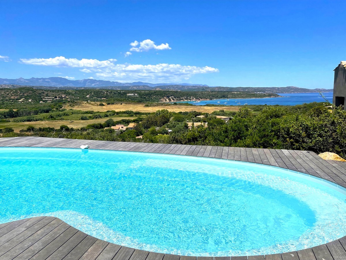 "Soladela" is a new contemporary wooden villa of 150m2 with a magnificent view of the maquis and the mountains. The single-story villa consists of 3 bedrooms, 2 bathrooms and 2 toilets. A 250m2 terrace surrounds the house and its heated (30°C) 10x4m pool. The villa is located in a recent, quiet and family-friendly residence, close to the most beautiful beaches of Corsica: Maora at 5mn, Spérone at 15mn and Santa Giulia at 20mn. The town of Bonifacio is at 10mn and Figari Airport is 20mn.