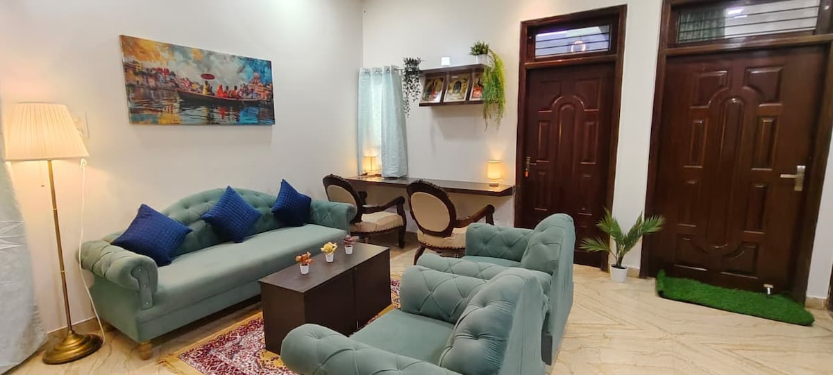Namaste! Welcome to Your Home away From Home in Varanasi! Luxury private space with a rooftop garden. Perfectly located under 20 minutes from Varanasi's iconic sites (Shri Kashi Vishwanath temple & Ghats), this space offers a king-size bed, a fully equipped kitchen, Wi-Fi, a large android TV and a spacious terrace for relaxation or yoga. Whether you’re here to explore, meditate, or simply relax, we hope you’ll feel like home and leave with a sense of rejuvenation.