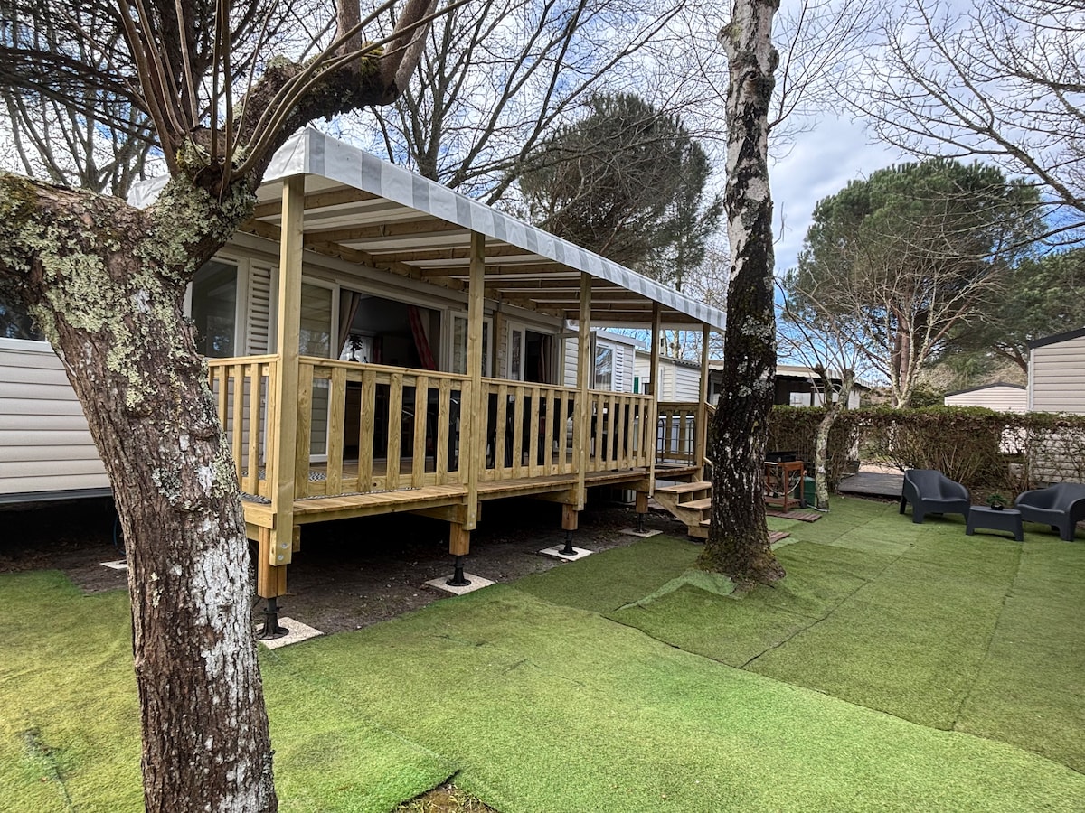 Charming Bora-Bora mobile home (6/8 people) 3 bedrooms (1 master suite/dressing room, 2 bedrooms (2 single beds + storage) + 1 large convertible sofa. Beautiful covered terrace, gas plancha for your meals. All the comforts of home (dishwasher, washing machine, satellite TV, etc.) for a great vacation. Access to Lake Biscarrosse beach and cycle path. Many activities are offered at the campsite 🏸🏓⛳️🏋️🏊🏻♂️🚴♀️ ⚠️ Fun Passes will be required for certain activities.