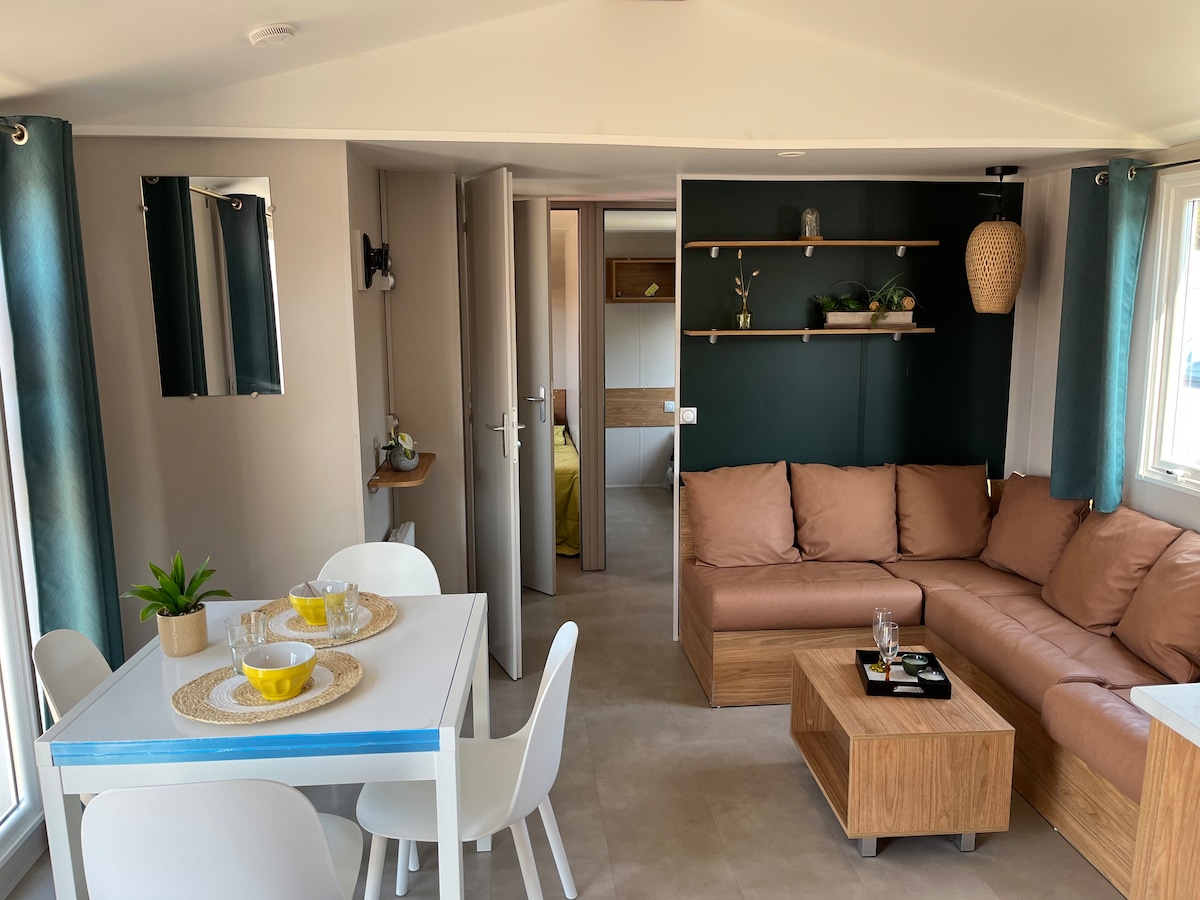 Charming Bora-Bora mobile home (6/8 people) 3 bedrooms (1 master suite/dressing room, 2 bedrooms (2 single beds + storage) + 1 large convertible sofa. Beautiful covered terrace, gas plancha for your meals. All the comforts of home (dishwasher, washing machine, satellite TV, etc.) for a great vacation. Access to Lake Biscarrosse beach and cycle path. Many activities are offered at the campsite 🏸🏓⛳️🏋️🏊🏻♂️🚴♀️ ⚠️ Fun Passes will be required for certain activities.