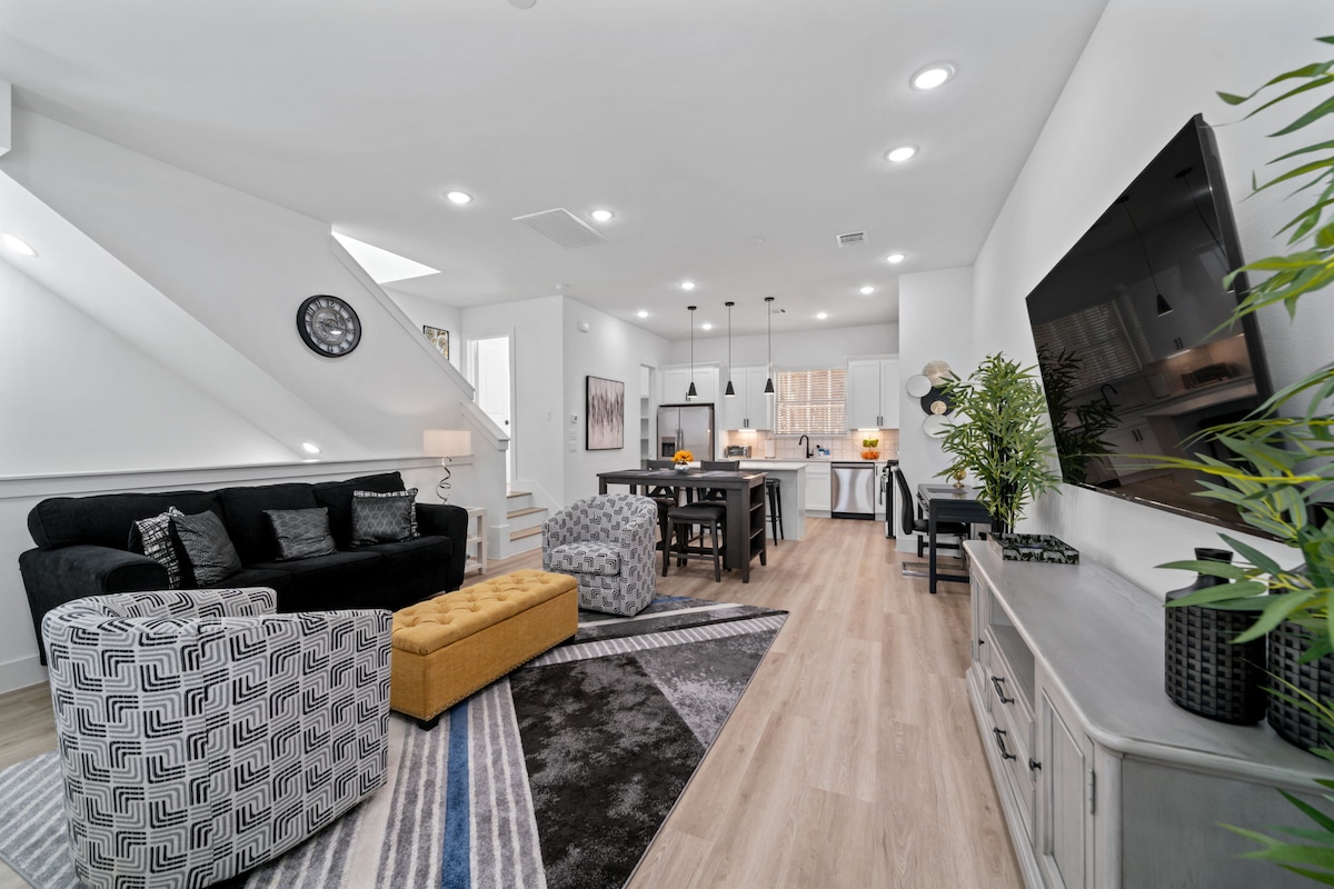 Welcome to our stylish 3 bedroom 2.5 bathroom Houston retreat nestled in vibrant East Downtown Houston! Enjoy a central location located near the "We Love Houston Sign" and attractions like Discovery Green, Minute Maid Park, Toyota Center, Museum District, and so much more (see listing description for distance to attractions). With a sleek design and a stunning city skyline view, this space offers both comfort and sophistication. Experience the best of Houston from our centrally located retreat!
