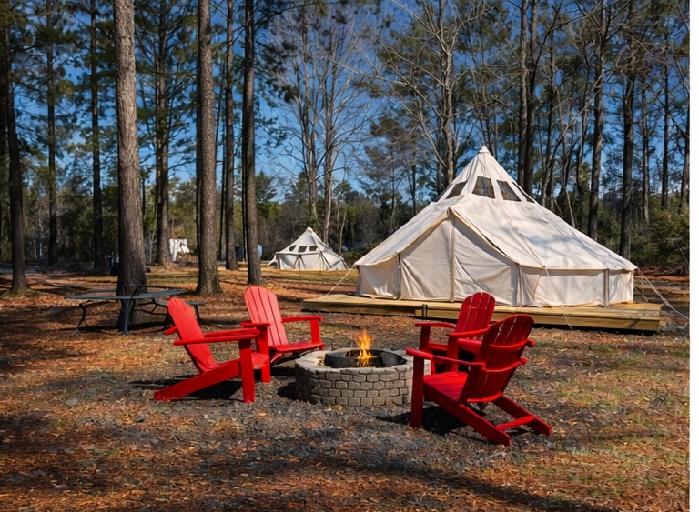 <p>Our Glamping Tents give you a closer connection to the outdoors without giving up comfort. These tents are thoughtfully set up with real beds and solid flooring, creating a relaxed and grounded stay. Fall asleep to night sounds, wake up to soft morning light, and enjoy the feeling of being part of the landscape rather than separated from it. This is a favorite for guests who want something different than a cabin but more ease than traditional tent camping.</p>