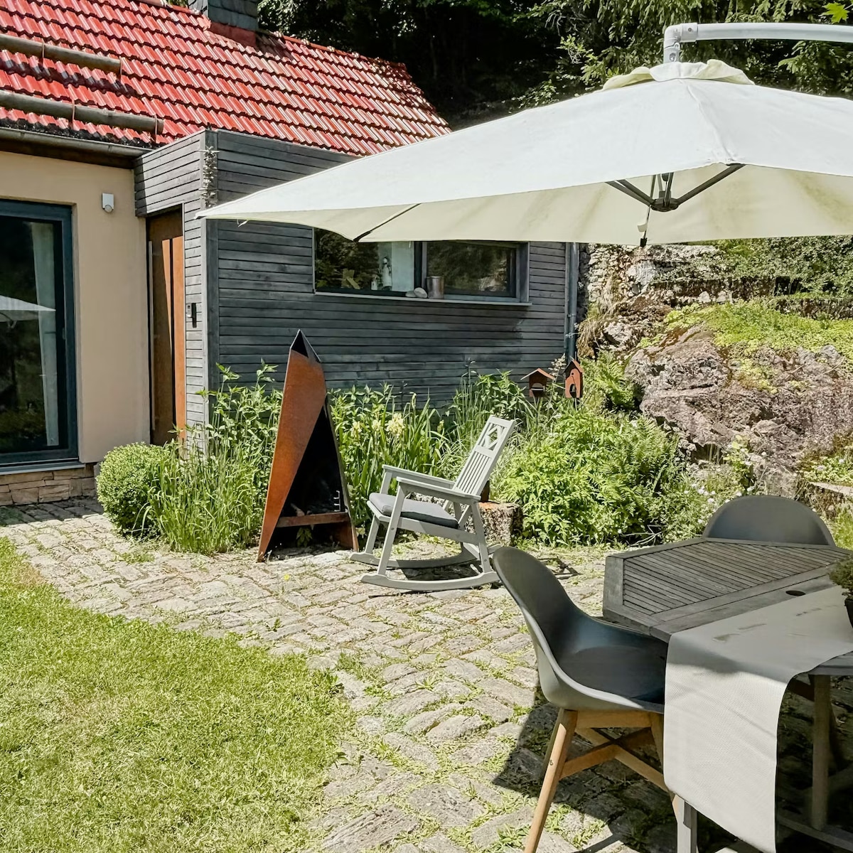 Within a 6000 sqm plot below the Veste Coburg you get a bungalow with every comfort. 3 rooms, 100 sqm, with kitchen (equipped with everything), two bathrooms, secluded terrace with large garden. Absolutely quiet and yet right in the middle of it all. 5 minutes by car and 10 minutes on foot to the center. High-quality furnishings. Floor-to-ceiling windows with a wonderful view of nature and Coburg.