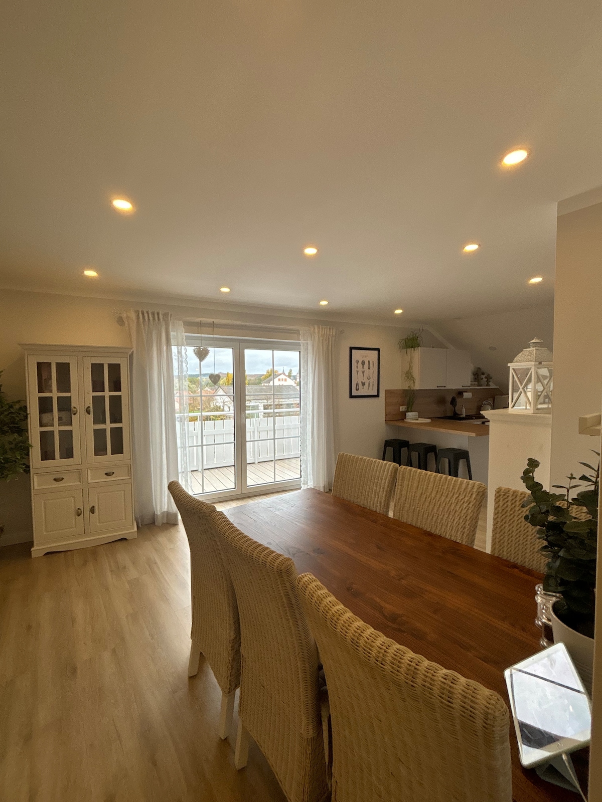 Wunderschöne Dachgeschosswohnung, hell eingerichtet, große Panoramafenster, Specksteinofen für kalte Tage, Platz für 4 Personen, zwei Schlafzimmer, zwei Bäder (ein kleines ohne Dusche, ein größeres, siehe Bilder)voll ausgestattet. Einkaufsmarkt ist nur 50 m entfernt, ruhig gelegen. Direkter Anschluss zu Rad- und Wanderwegen. Schwimmbad 250 Meter entfernt. Parkplatz direkt vor der Tür.