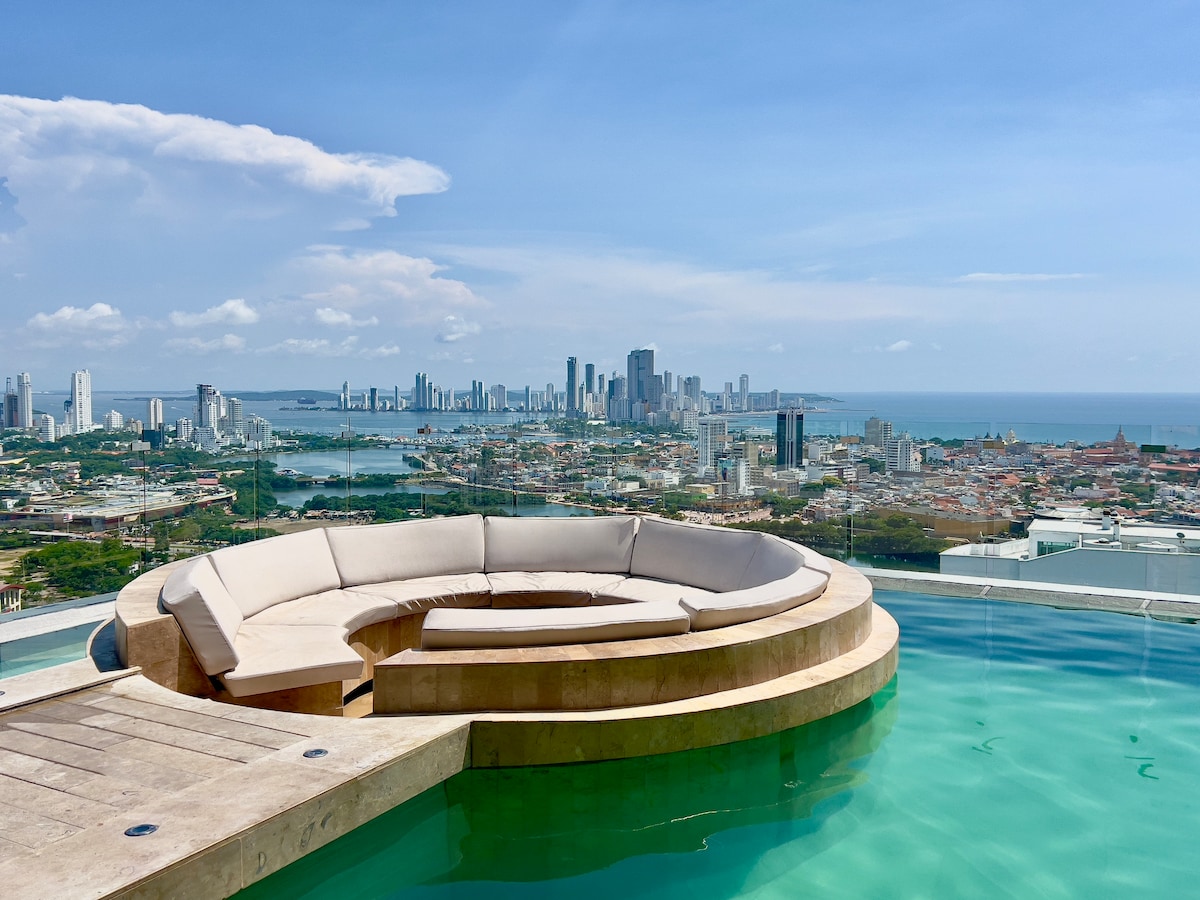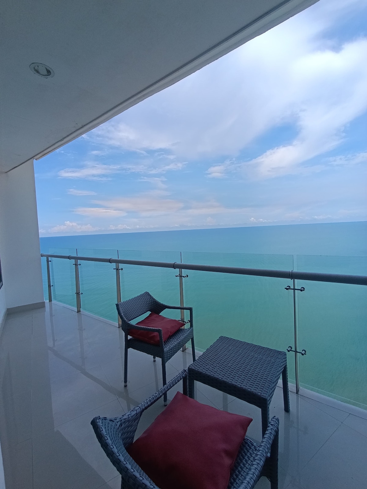 Breathtaking Views + Perfect Location Relax in luxurious splendor in this 1 bedroom, 1 bathroom, tastefully decorated, beach-front penthouse located in the 36th floor of one of Cartagena's latest and most prestigious buildings: Palmetto Beach. Wide, stunning view to the ocean. Furnished to luxury hotel standards with large screen TV in the bedroom and living room. Amenities in the building include a fully equipped gym and a top-floor pool.