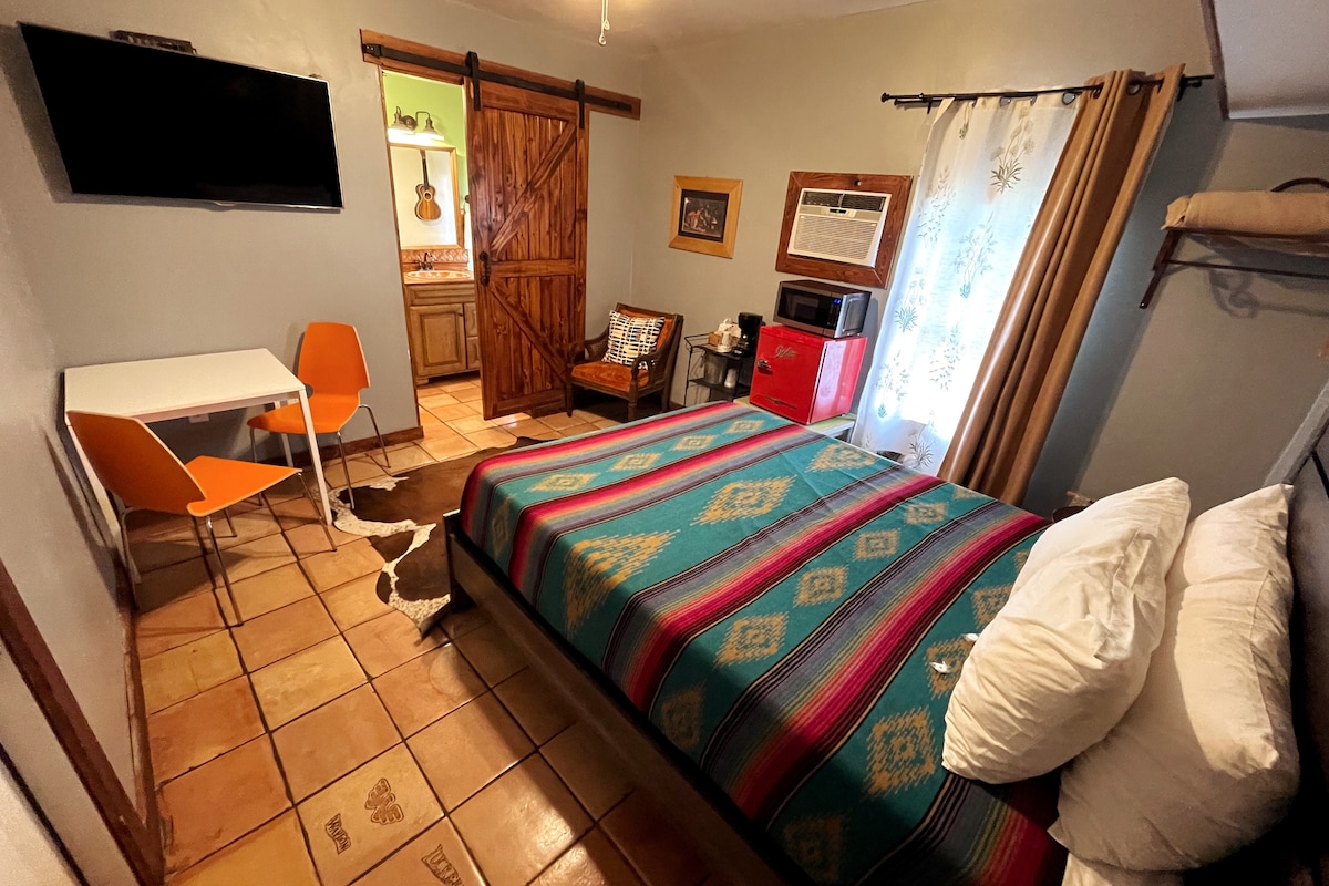 Rustic rooms with a deck and beautiful view! Built in an original Dance Hall on site of historic Texas town, population 0. Your deck is steps away from the milk barn and hen house. Not the Ritz Carlton! Get ready for farm life! Smells. Sounds. Sites. You are only feet from farm yard. Saloon open Wed-Sun. Lawn games. Four walls and a comfy bed. Shared bathroom and showers. Only 8 miles from downtown Fredericksburg. Food, bar, live music Wed-Sun. Wineries close. Get away!