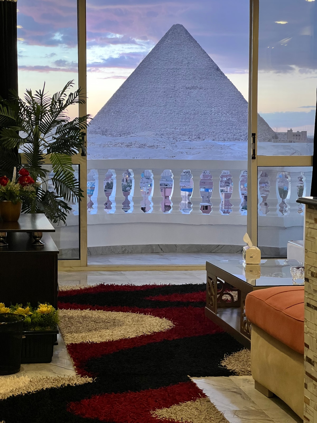 Welcome to our apartment! Just 5 minutes’ walk from the Sphinx and Pyramids entrance, with a stunning balcony view. Located in a safe and lively local area near restaurants, cafés, fruit shops, markets, and pharmacies. The apartment is fully air-conditioned, with fast unlimited Wi-Fi, a well-equipped kitchen, clean sheets, fresh towels, and a calm atmosphere. Probably the best place to enjoy the Pyramids view!