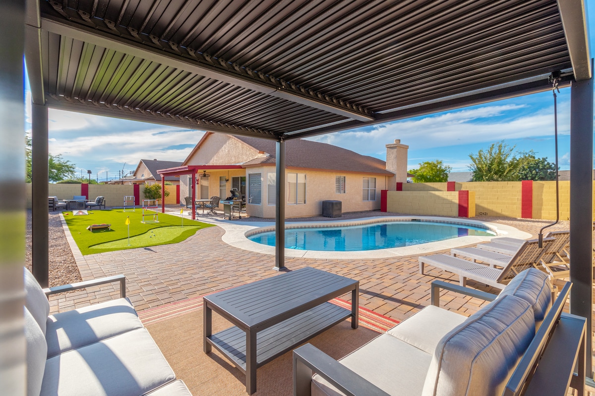 Escape to your own private retreat—unwind in the wood sauna, soak under the stars in the hot tub, or fire up the pizza oven for the perfect night in. This stylish three-bedroom, two-bath retreat offers more than just a place to stay—it’s an experience. With a seamless blend of modern comfort and resort-style amenities, your unforgettable getaway begins here. Ideally located just three miles from Peoria Sports Complex and two miles from Arrowhead.